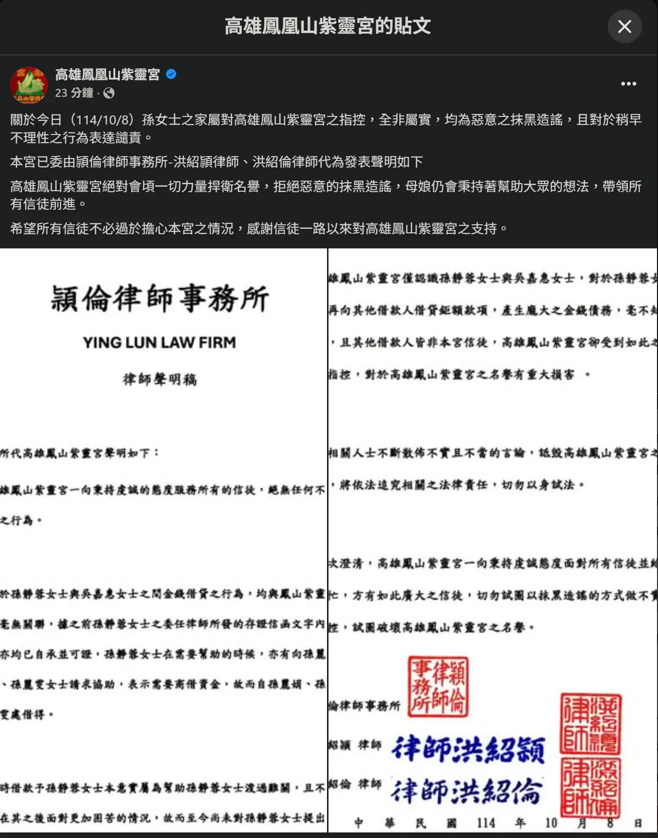本宮已委由頴倫律師事務所-洪紹頴律師、洪紹倫律師代為發表聲明如下