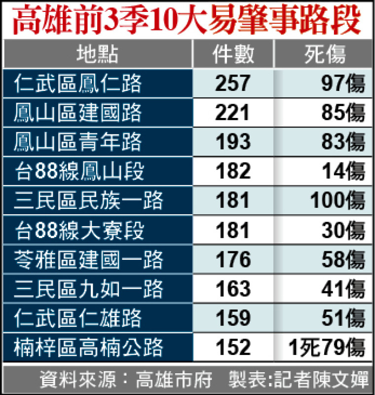 高雄市今年前三季新十大易肇事路段出爐,以仁武區鳳仁路發生二五七件最多,人口數最