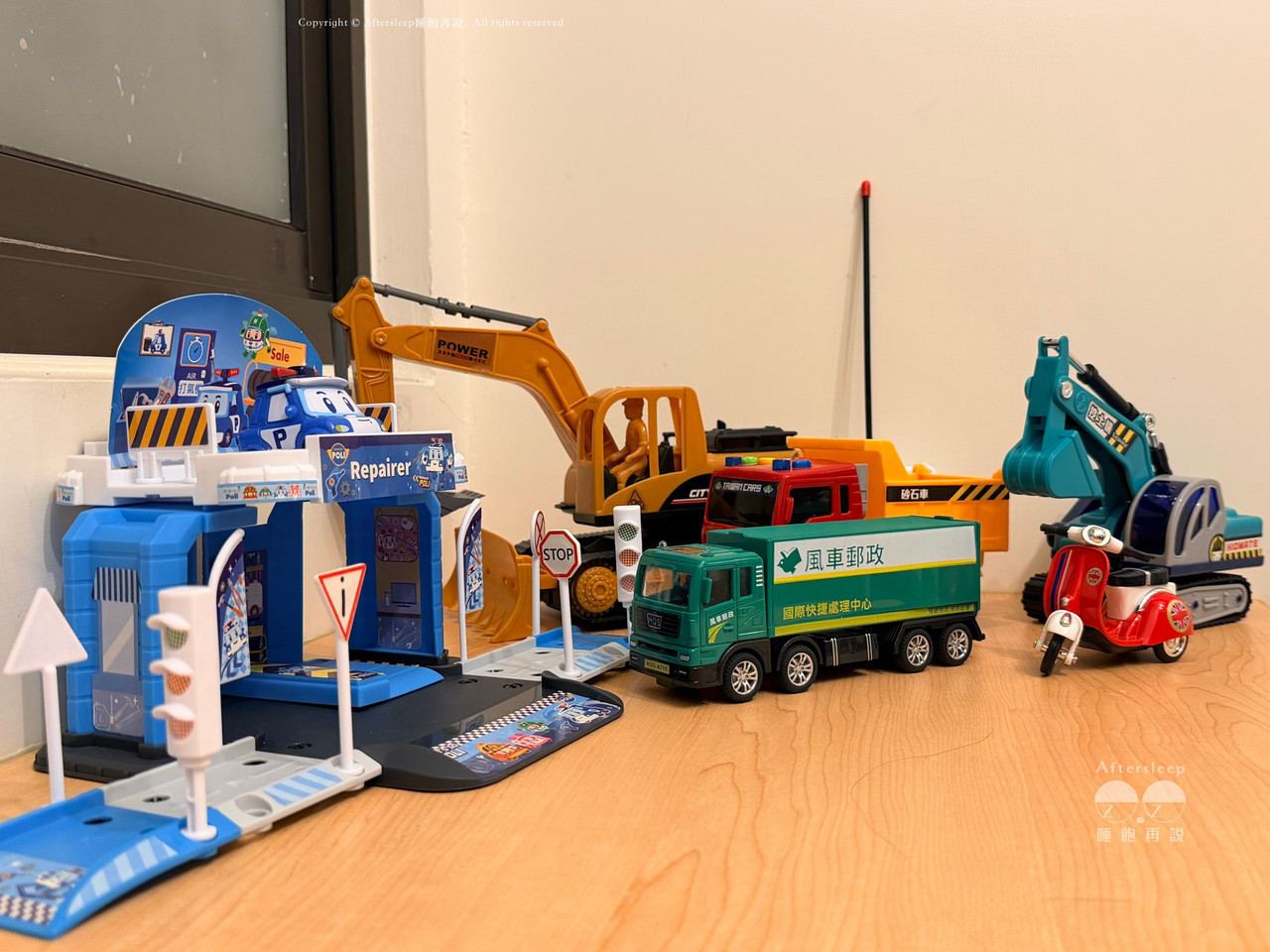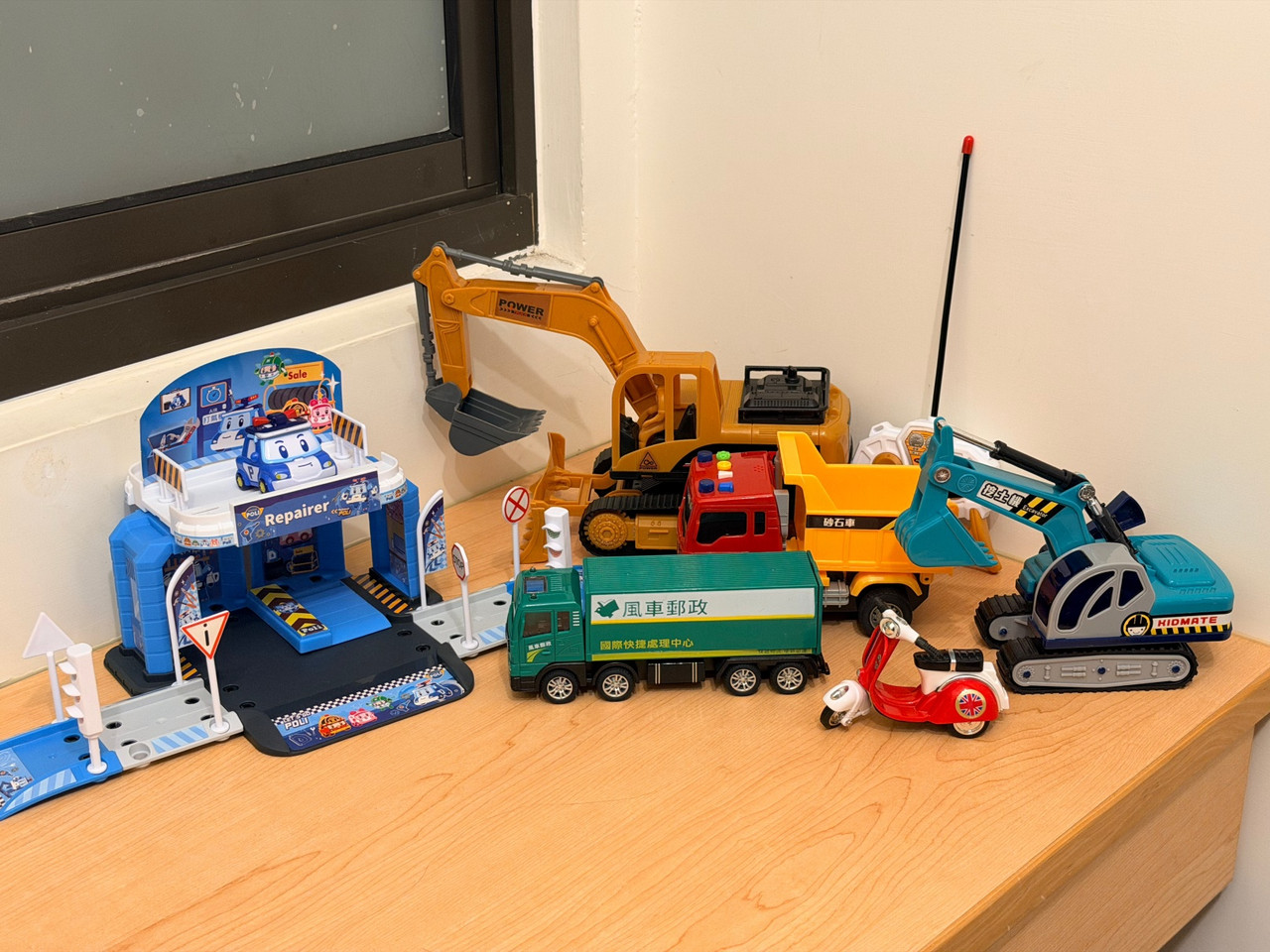 (最大台的挖土機為遙控車,但只能控制最下面的車輪,功能正常)