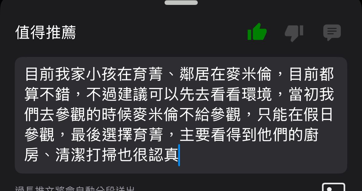 我兒子今年剛滿兩歲,想讓他去上幼幼班,目前看了幾家後想讓他去育菁或是麥米倫,想請問有在這兩家上課過的家長能給我一些建議嗎?哪家比較好呢?謝謝