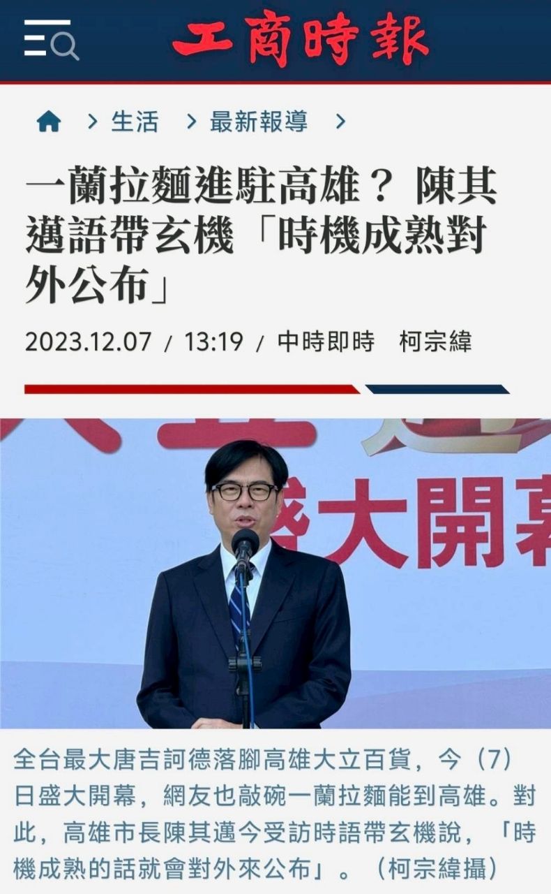 [閒聊] 一蘭拉麵進駐?陳其邁語帶玄機?