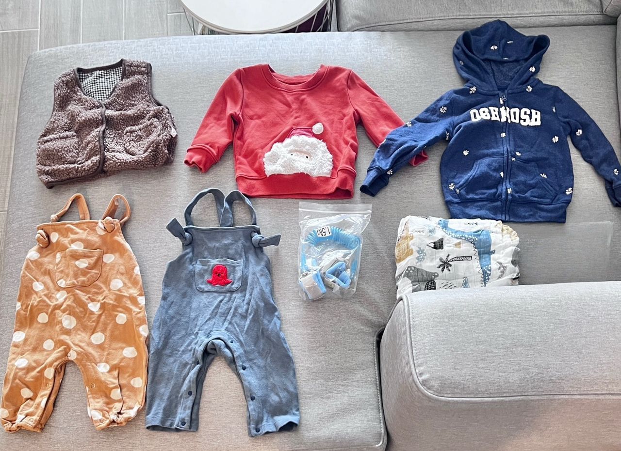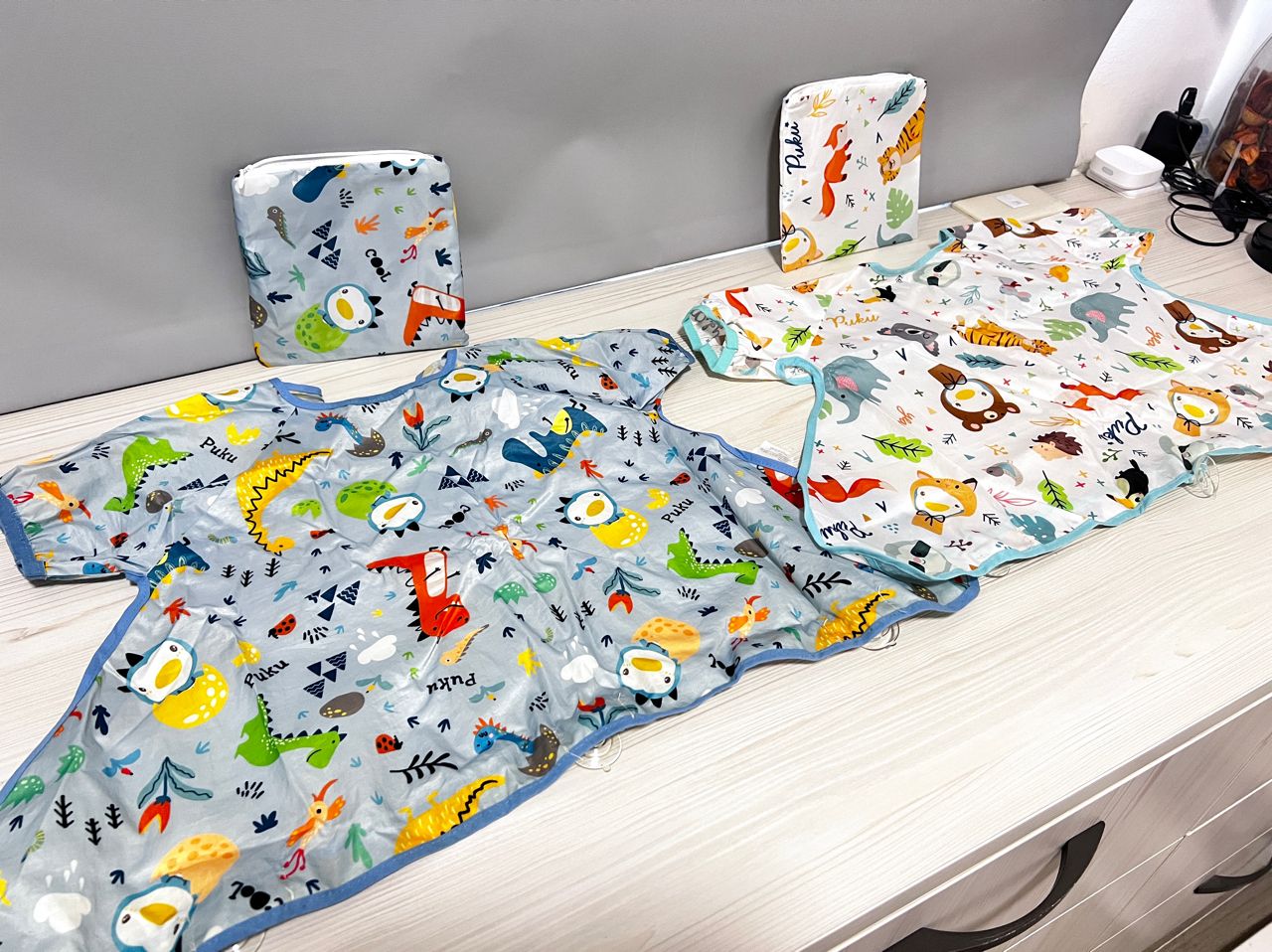 雙面外套)、帽子2頂、防踢被1件、恐龍包巾1件、圍兜4件。