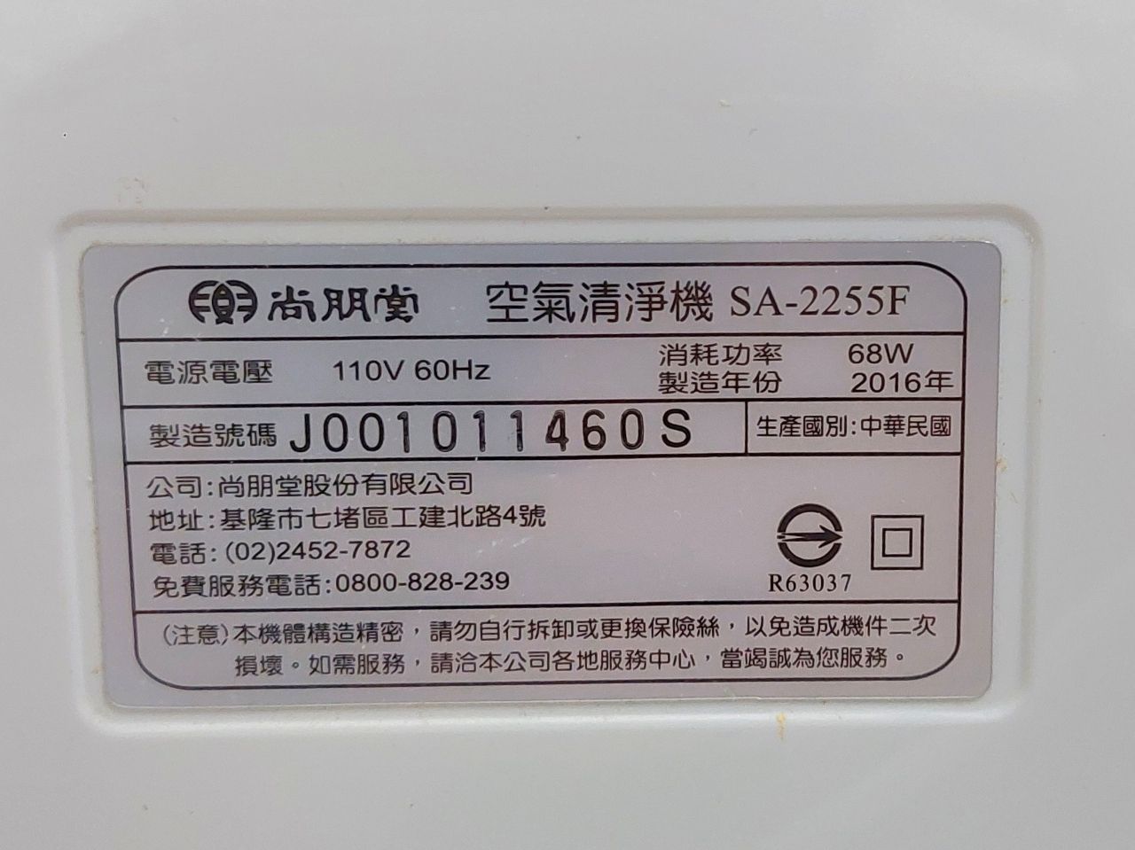 尚朋堂空氣清淨機 型號SA-2255F
