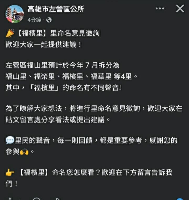後來才知道有命名小組,可能市政府有收到許多申訴意見,目前在區公所fb上辦理徵詢,