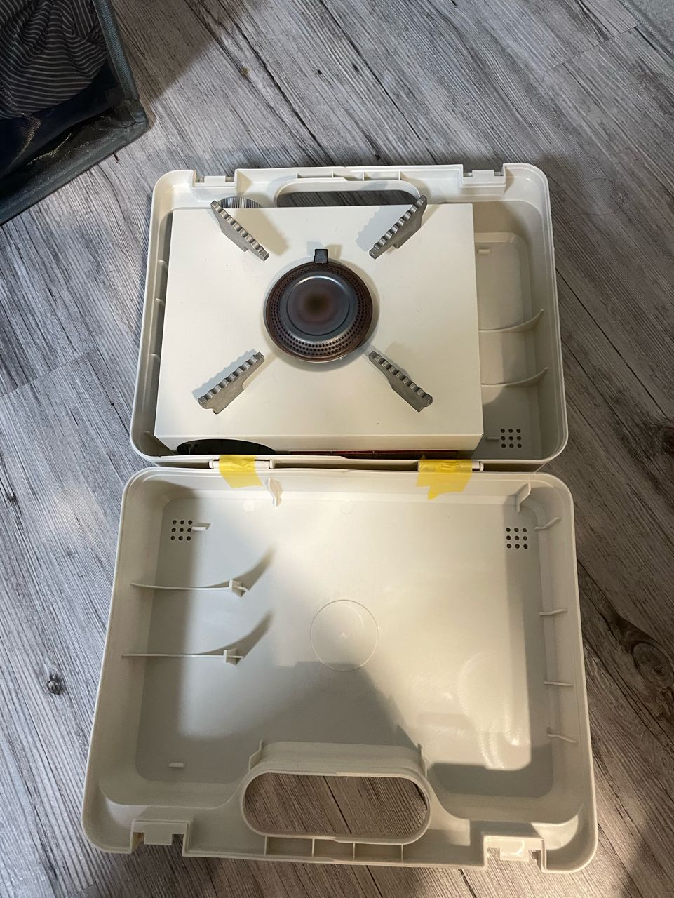 小型卡式爐使用過兩次 外盒卡榫斷掉用膠帶黏起來