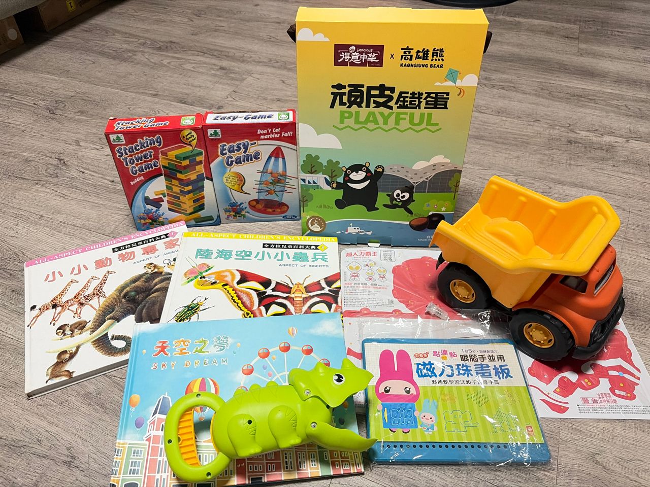 有彈珠台、益智玩具,玩具車、恐龍夾、磁力珠畫板、百科全書、繪本、超人力霸王小提