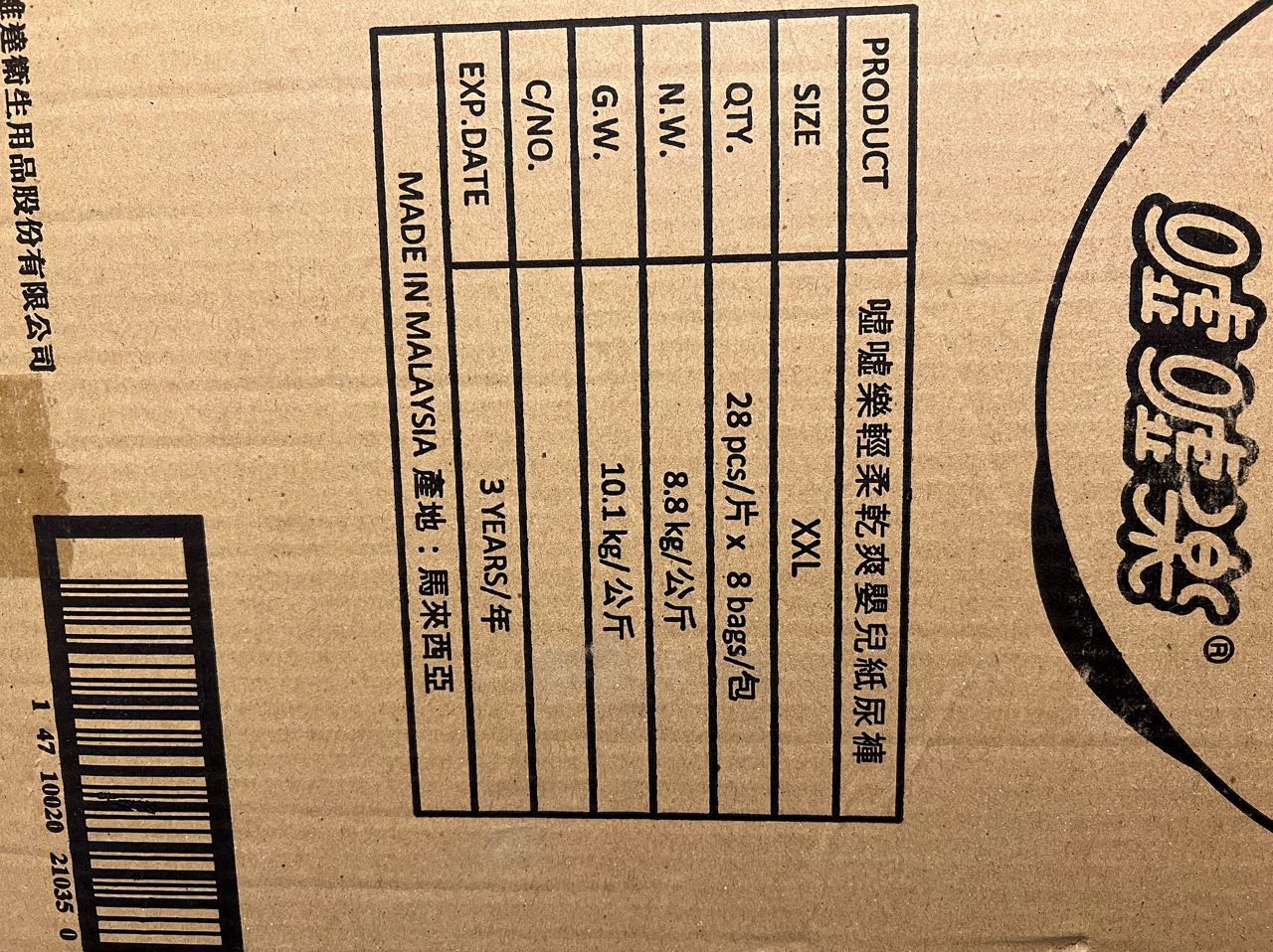 物品名稱: 噓噓樂嬰兒紙尿褲XXL(28片*8包)