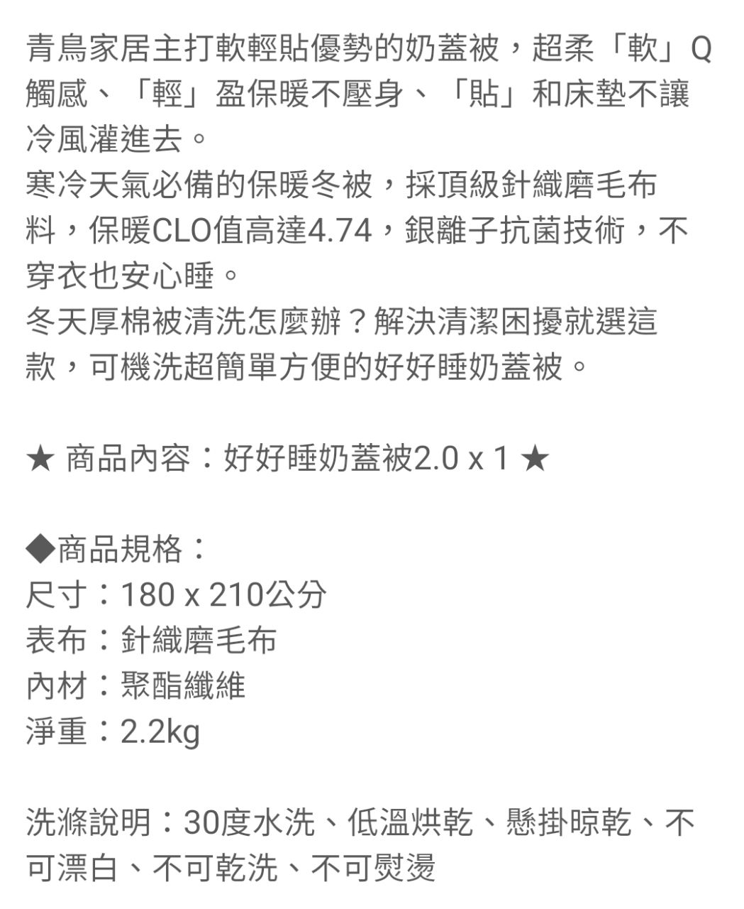 1.青鳥家居奶蓋被 2.0,全新未拆,售1350元。