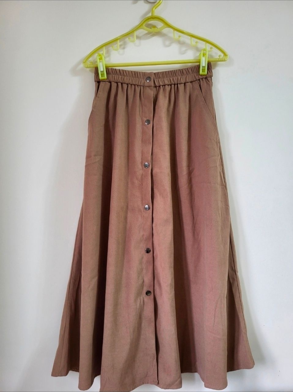M號、鬆緊帶腰圍32cm,裙長85.5cm,兩側有口袋,衣況佳少穿,無髒污毛球,售90元