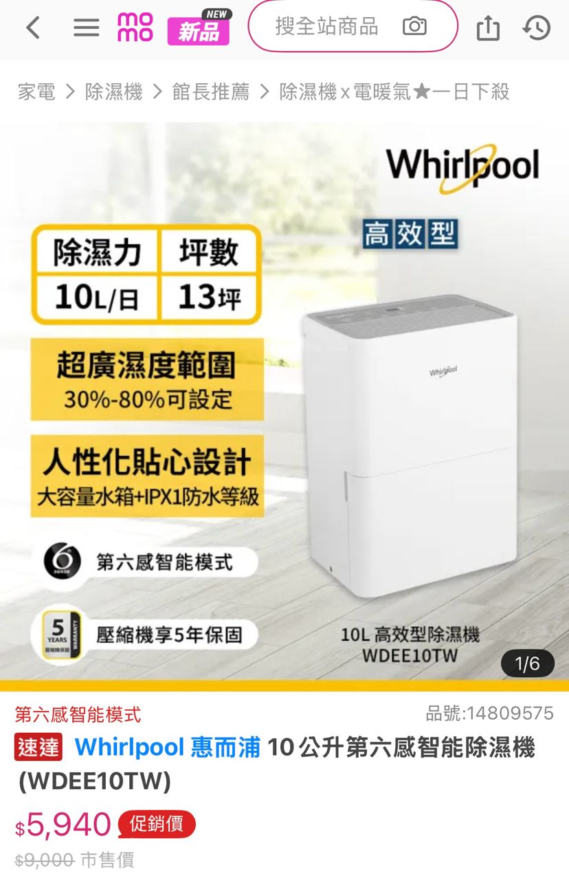 商品名稱:Whirlpool 惠而浦10L除濕機