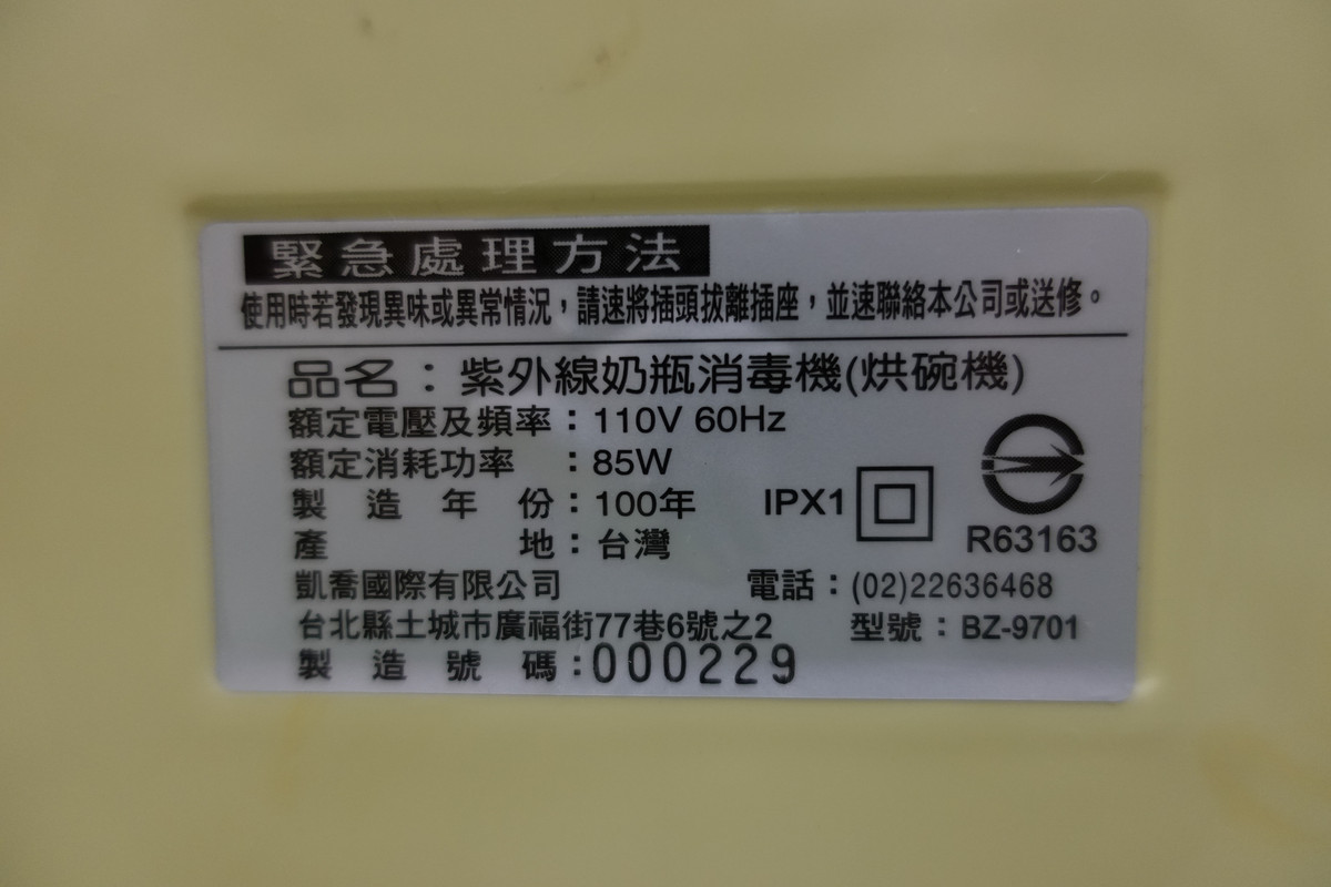2、KOKI紫外線奶瓶消毒機(烘碗機):恩典牌,長27*寬35*高44,請自行清潔