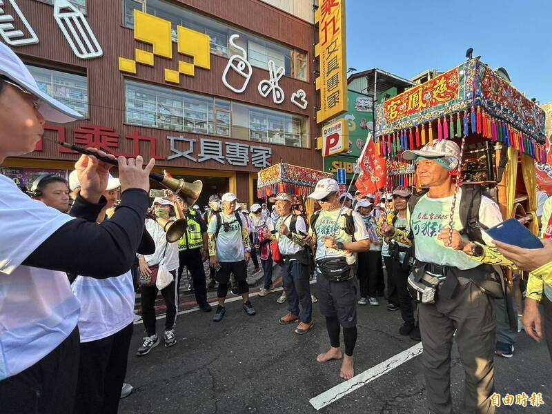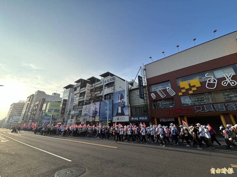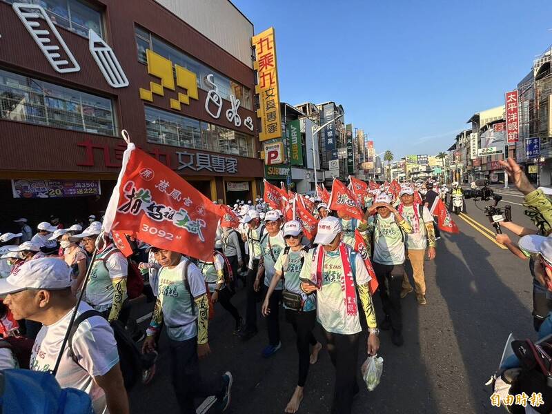 行腳隊伍迎向晨曦浩浩蕩蕩出發。(記者羅欣貞攝)