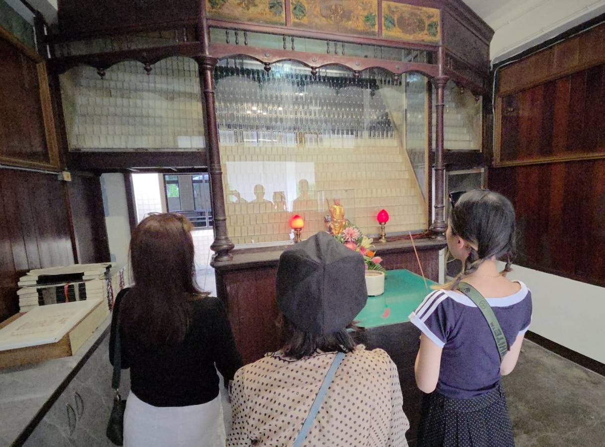 屏東市瑞光里長盧逸洋(右二)今天下午帶著佐藤香里(左二)來到聖母宮拜拜,聖母宮