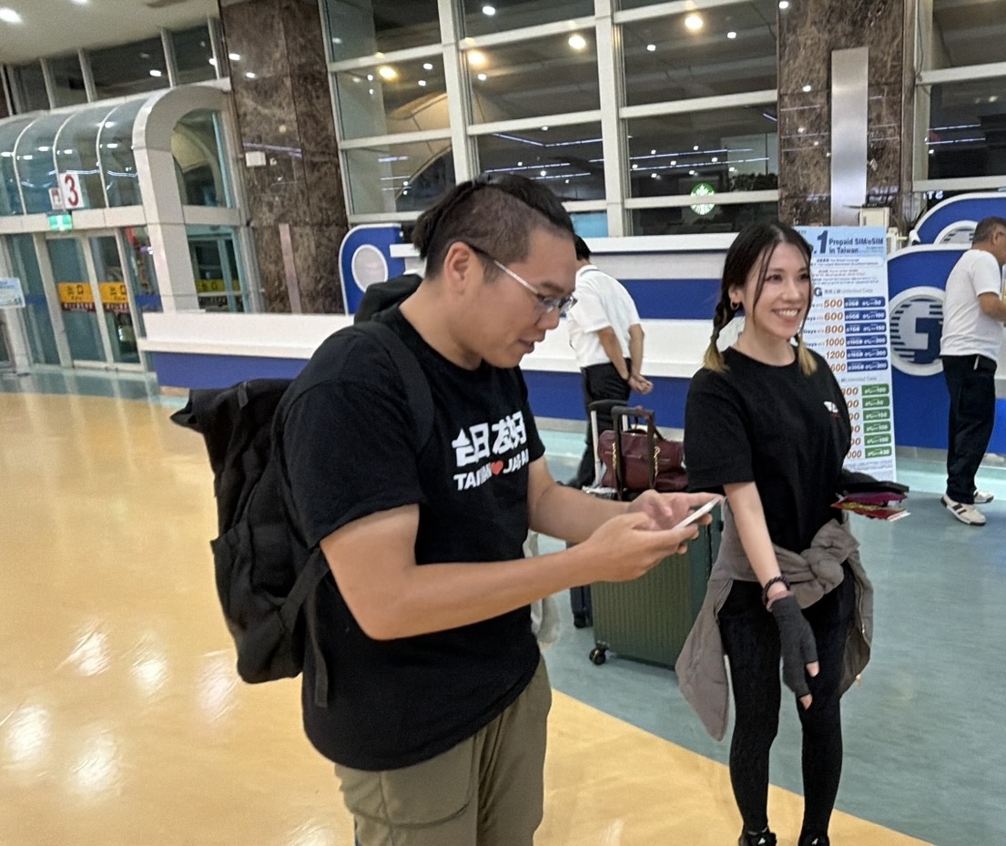 佐藤香里(右)7日從日本飛來台灣傍晚抵達小港機場,盧逸洋(左)特別前往接機。圖