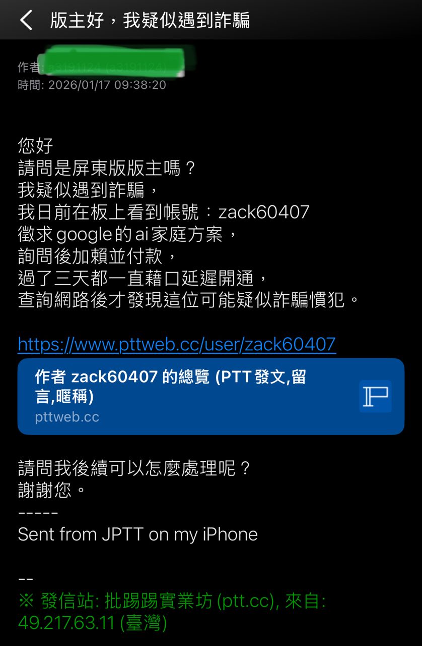 針對今早(1/18)早上關於zack60407版友的發文(#1fR4Rz60),原始文章內提到,zack