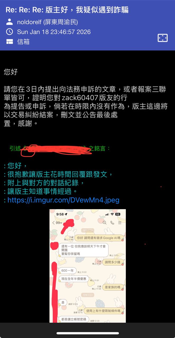 當下版主已要求申訴方三日內提出向法務提出的申訴或報案三聯單,倘若無法提出則版主