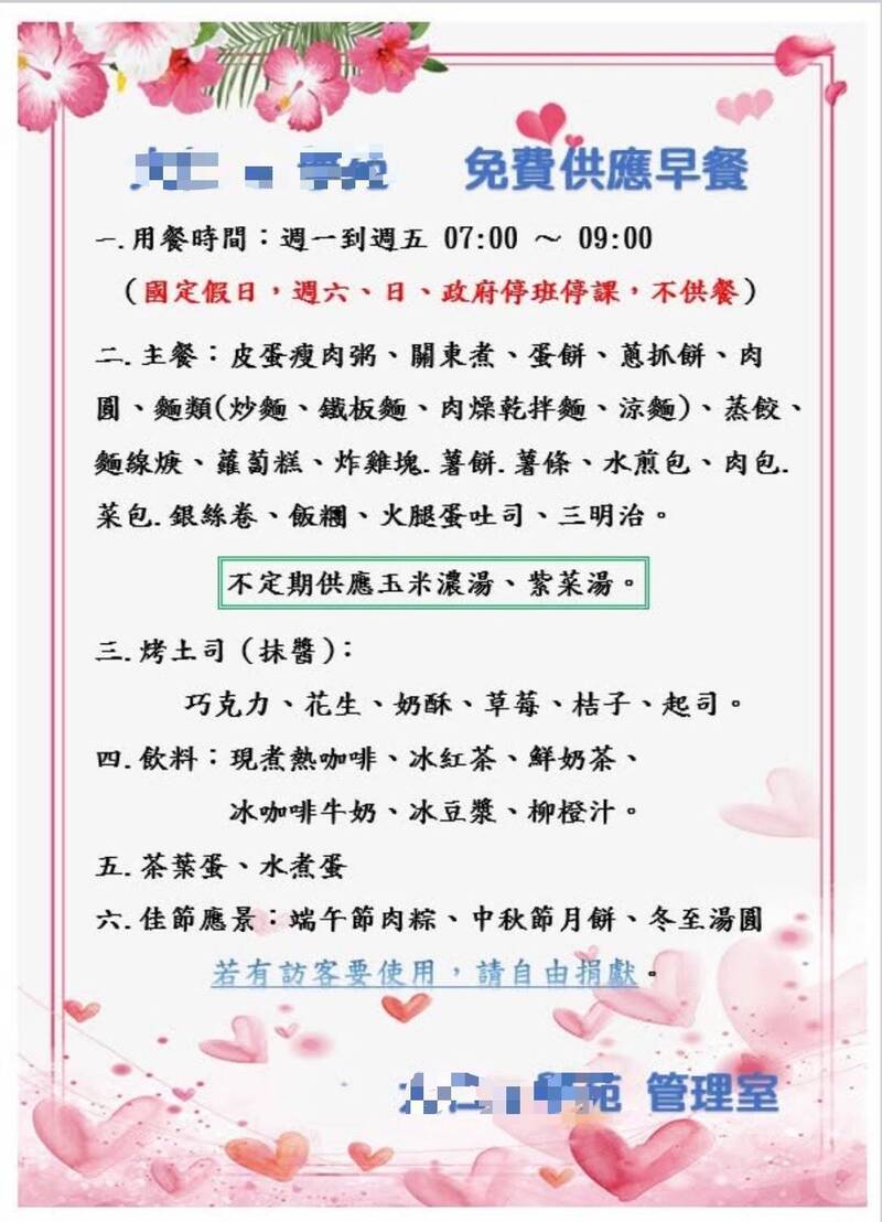房東每週一到週五早上7點到9點供應早餐,主餐有皮蛋瘦肉粥、關東煮、蛋餅、蔥抓餅、