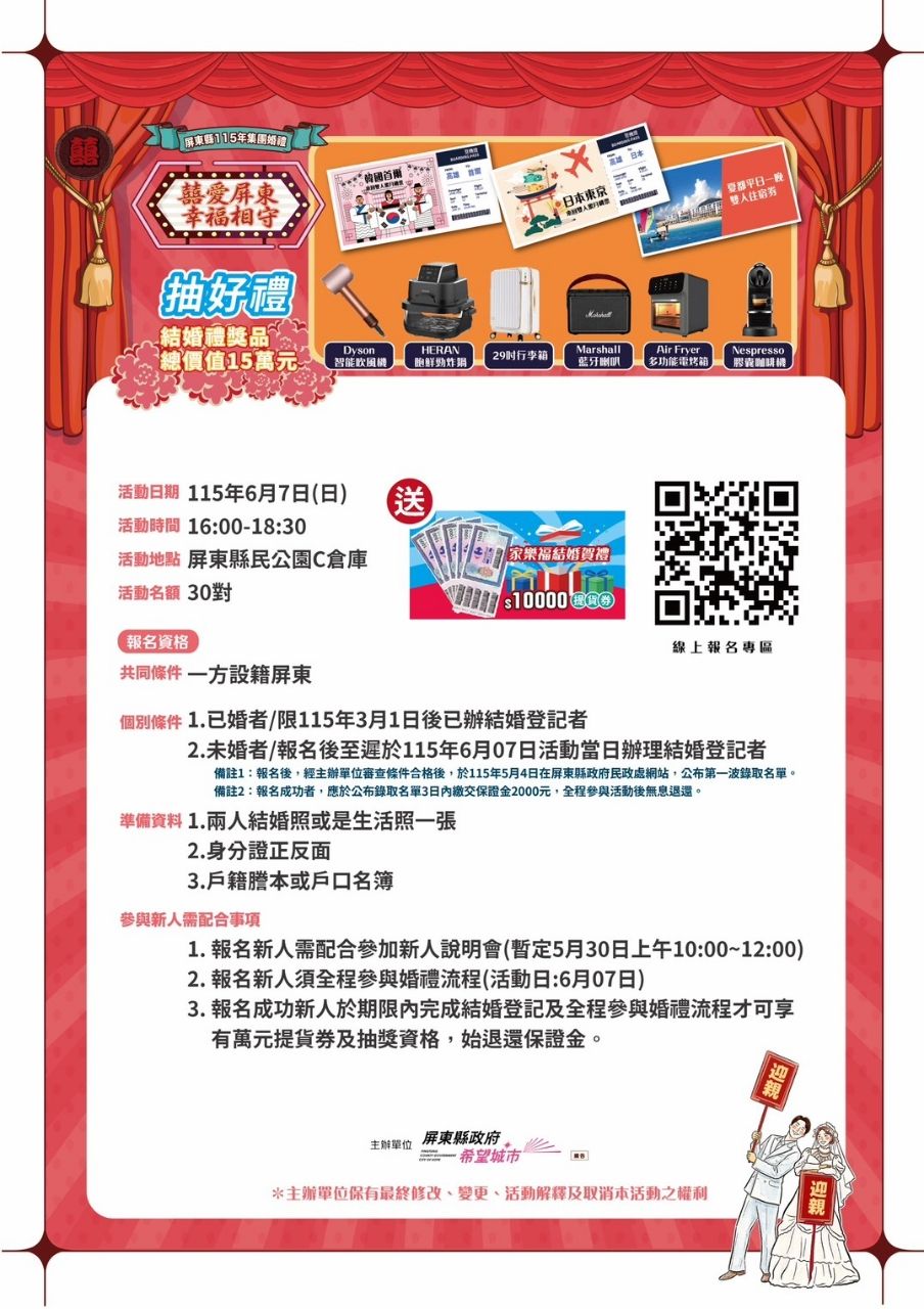 明天(4/28)上午10點開放報名,只要其中一方設籍屏東,就可以參加,祝福所有情人終