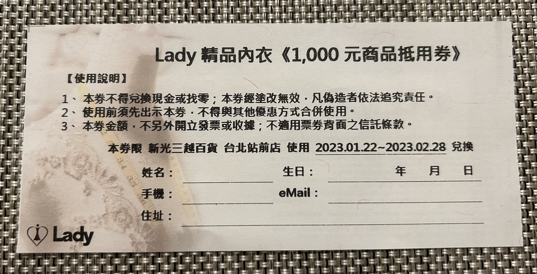 商品名稱:1.JINS眼鏡兌換劵(1980元以下) 2.Lady精品內衣1000元抵用劵