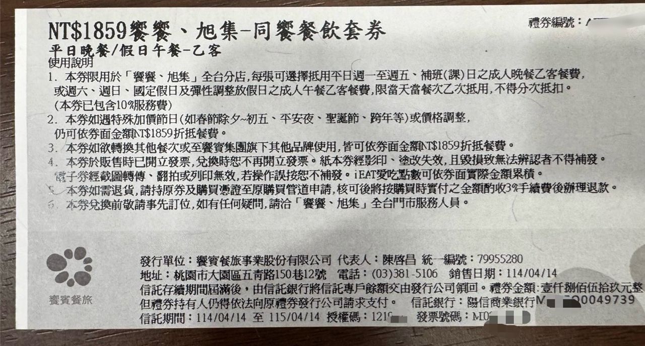 名稱:饗饗、旭集—平日晚餐、假日午餐券,共8張。