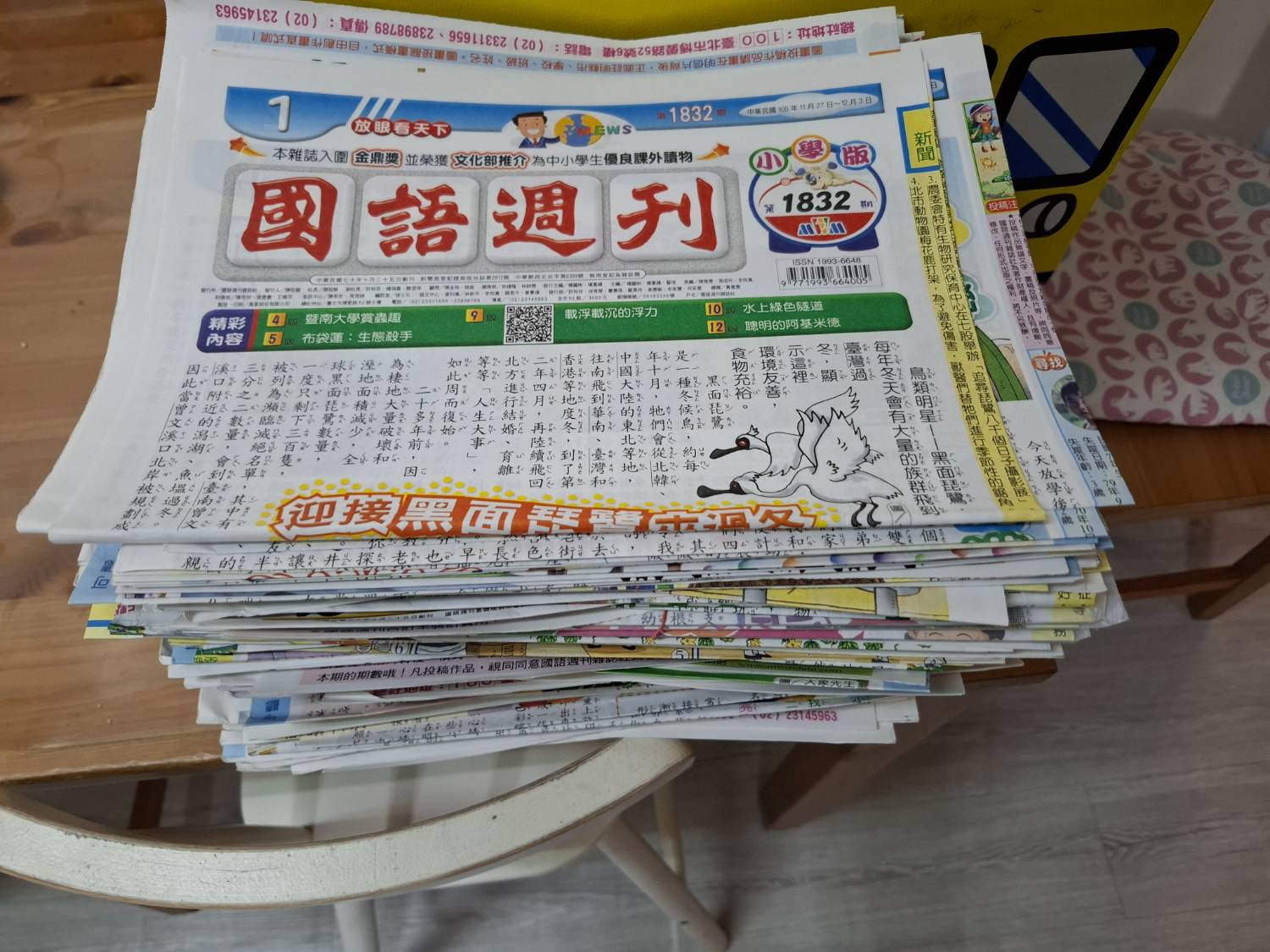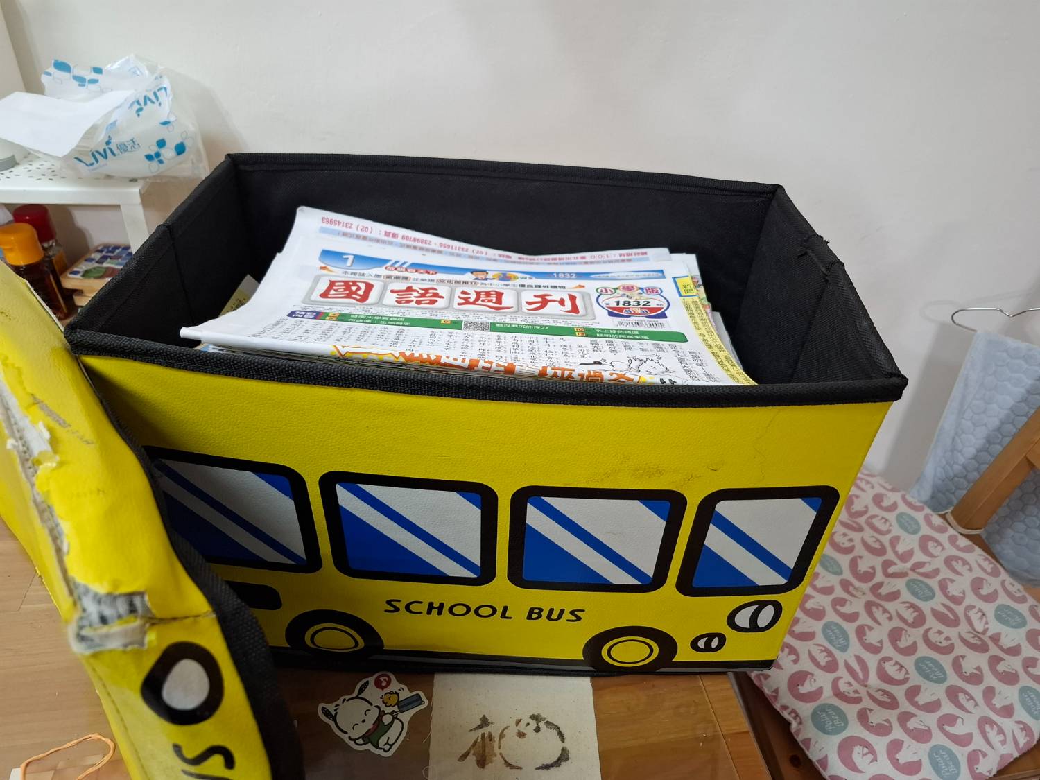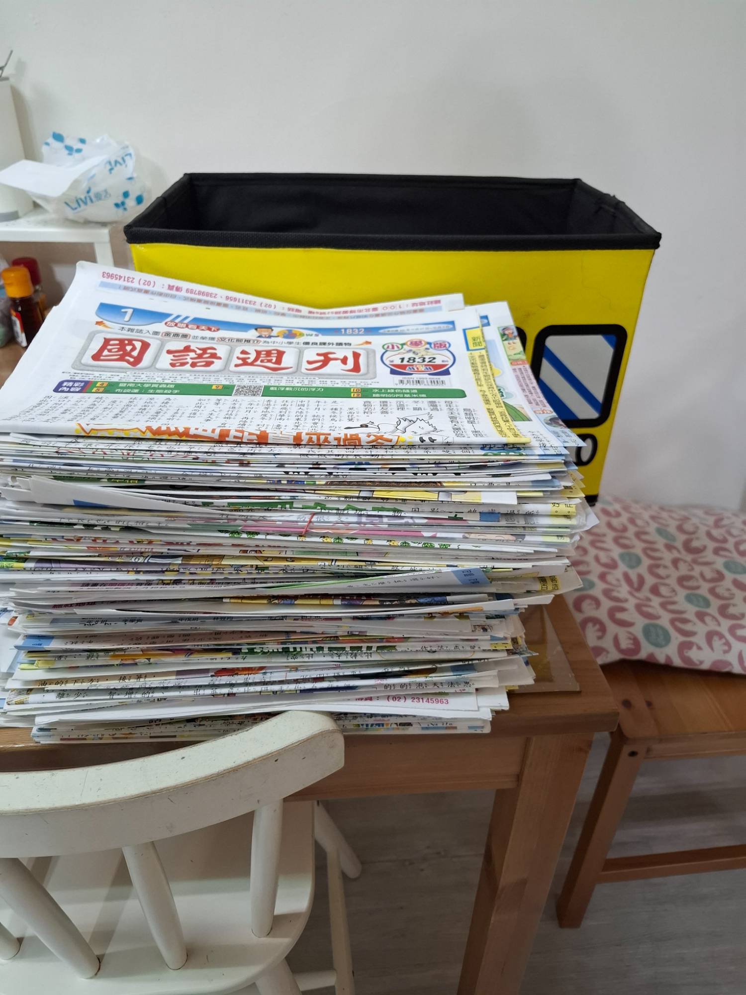 一疊國語週刊(包含外箱)、幾件女童衣物(適合身高110~120公分)、一件防水墊