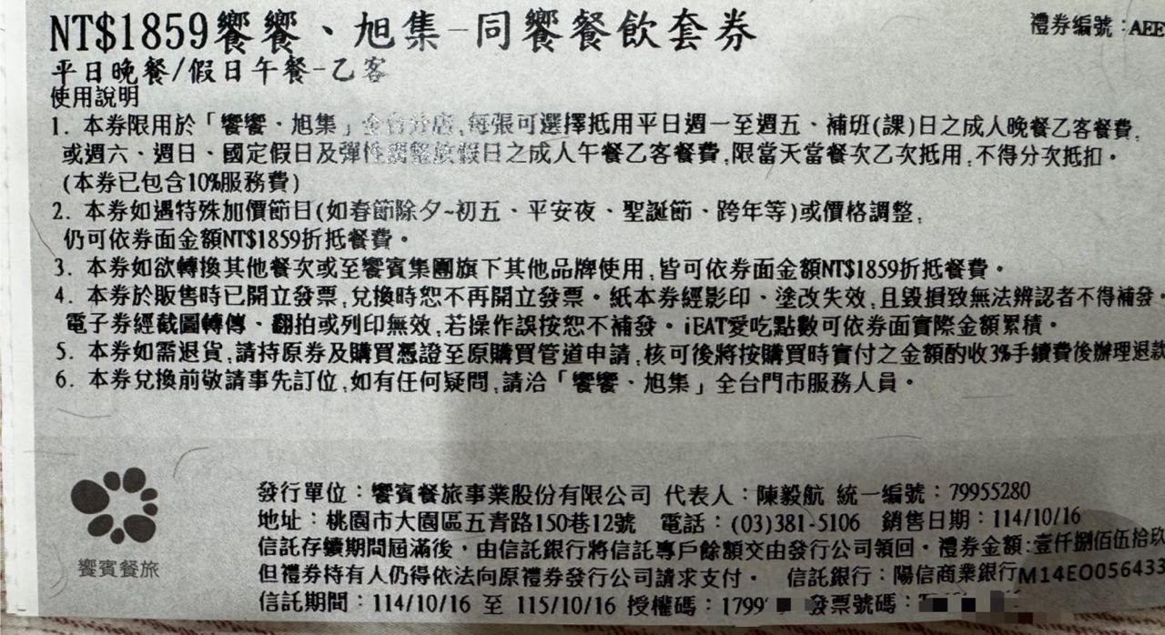 名稱1:饗饗、旭集—平日晚餐、假日午餐券,共4張。