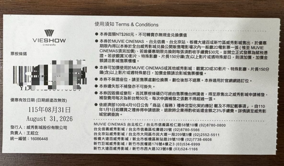 名稱2:威秀電影票,10張。