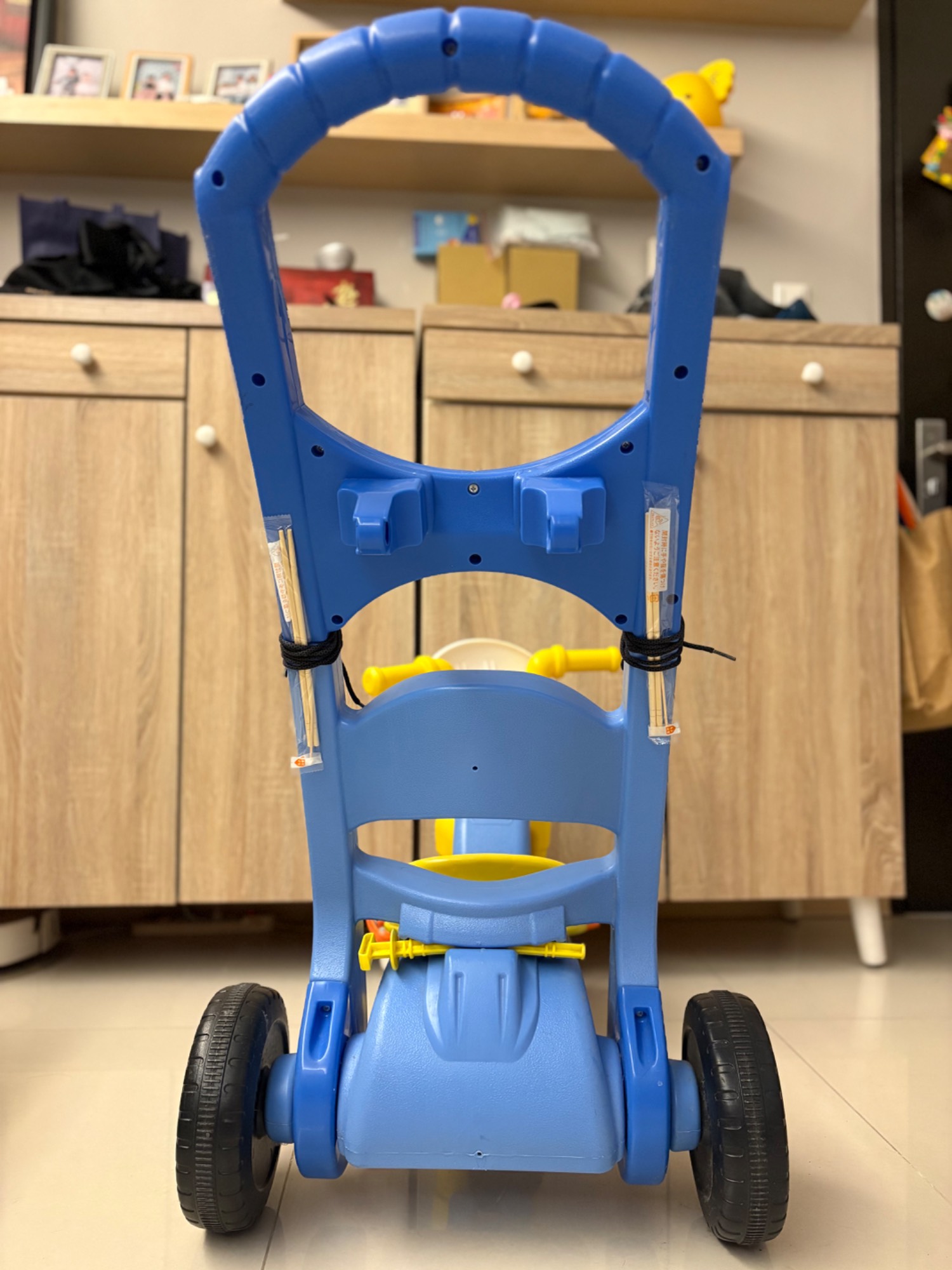 只有在家裡騎而已,不曾在戶外騎,後面把手今天被小孩凹斷,家裡只找得到竹筷暫時固
