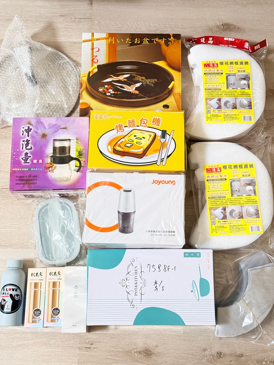 鍋蓋、沖泡壺、折疊餐盒、保溫瓶、茶盤、烤麵包機(用過)、慢磨機、雪平鍋、櫻花抽油