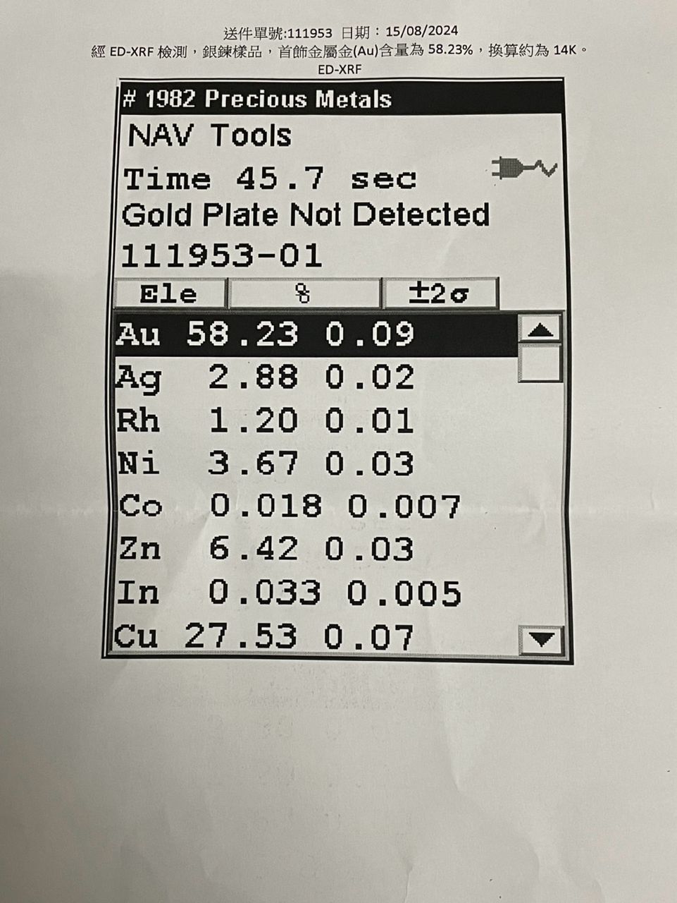 墜子為藍寶石十字架,銀鏈金屬含量為58.23%,約14k金。首飾金屬含量為73.65%,約18k