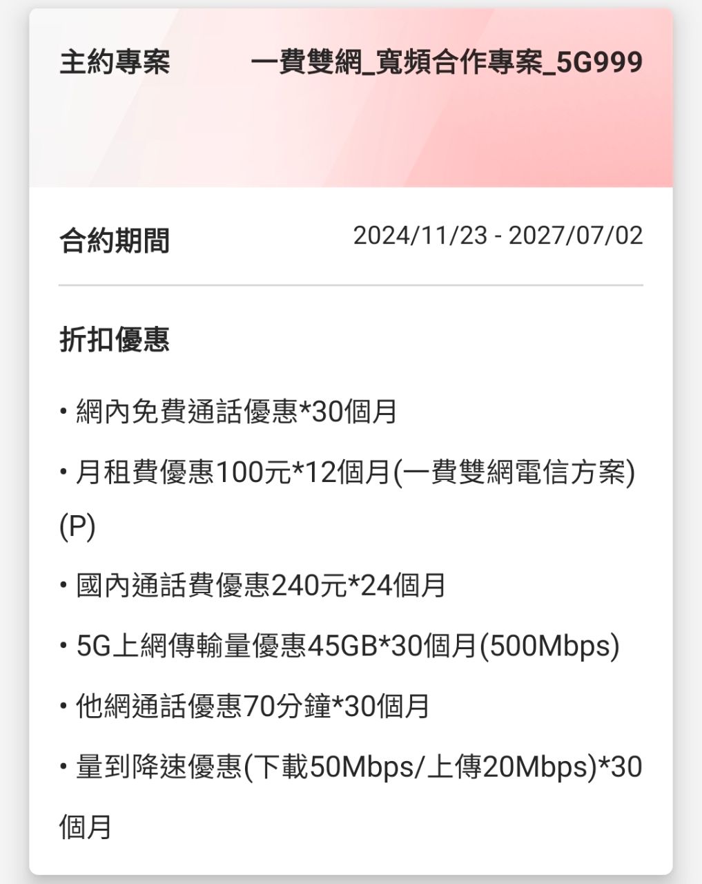 合約內容只有寫行動網路流量部份,固網印象是臺灣佳光100M。