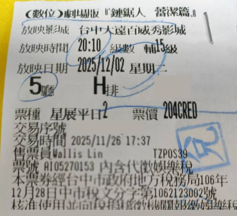 [贈送] 台中大遠百鏈鋸人電影票12/02