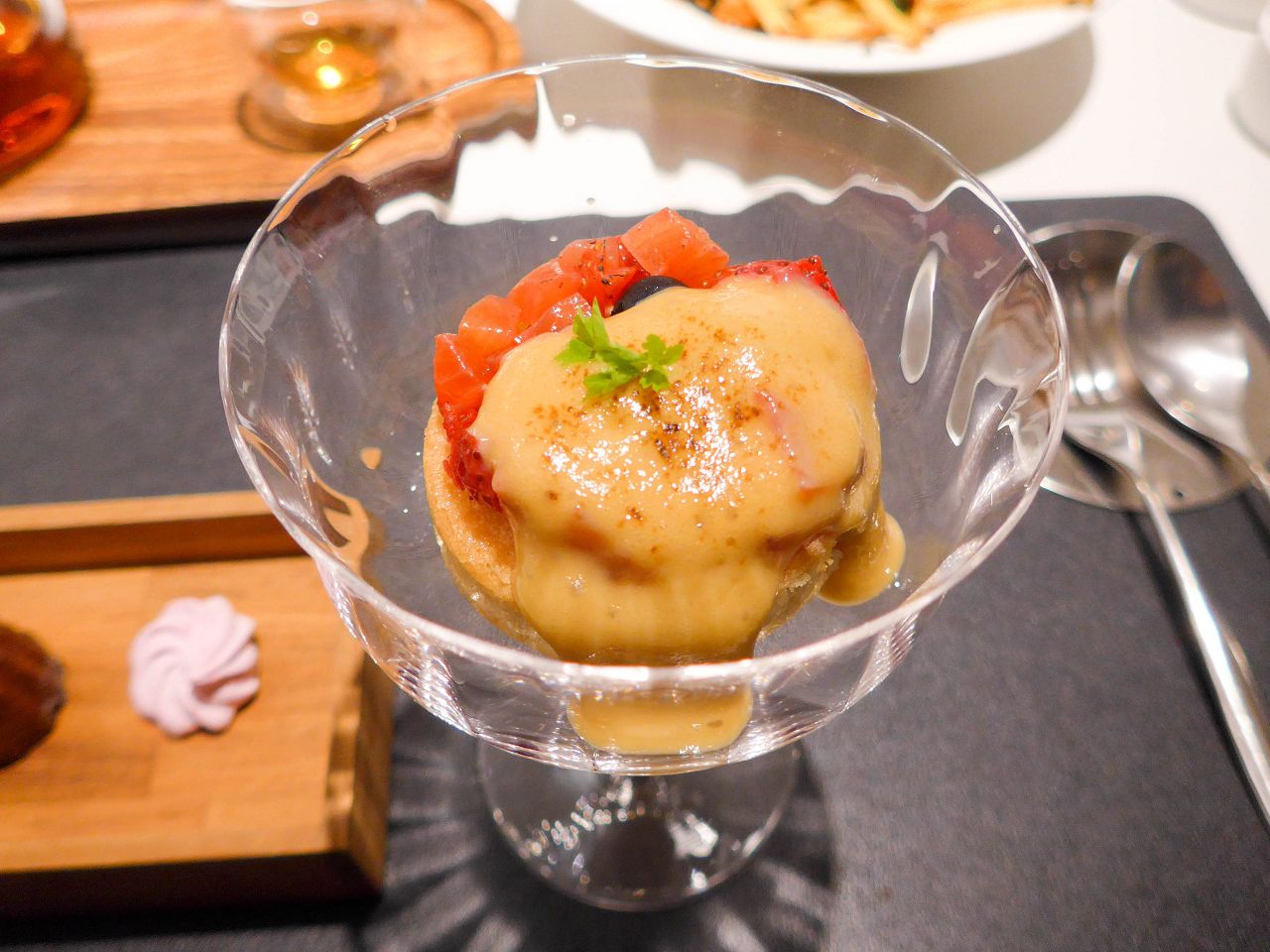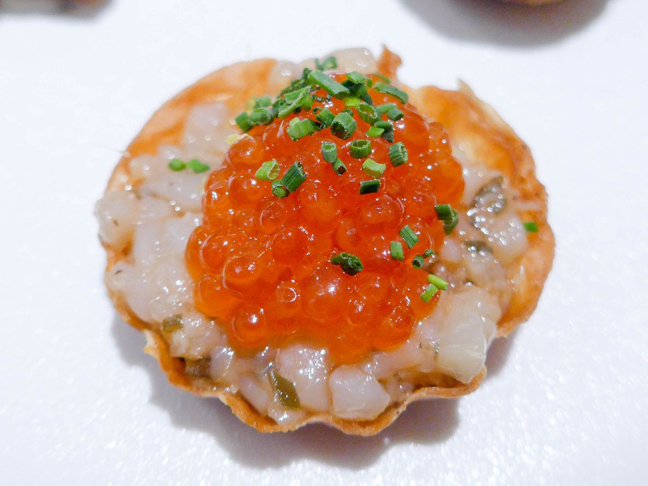 酥脆塔殼盛裝著北海道干貝和鮭魚卵,