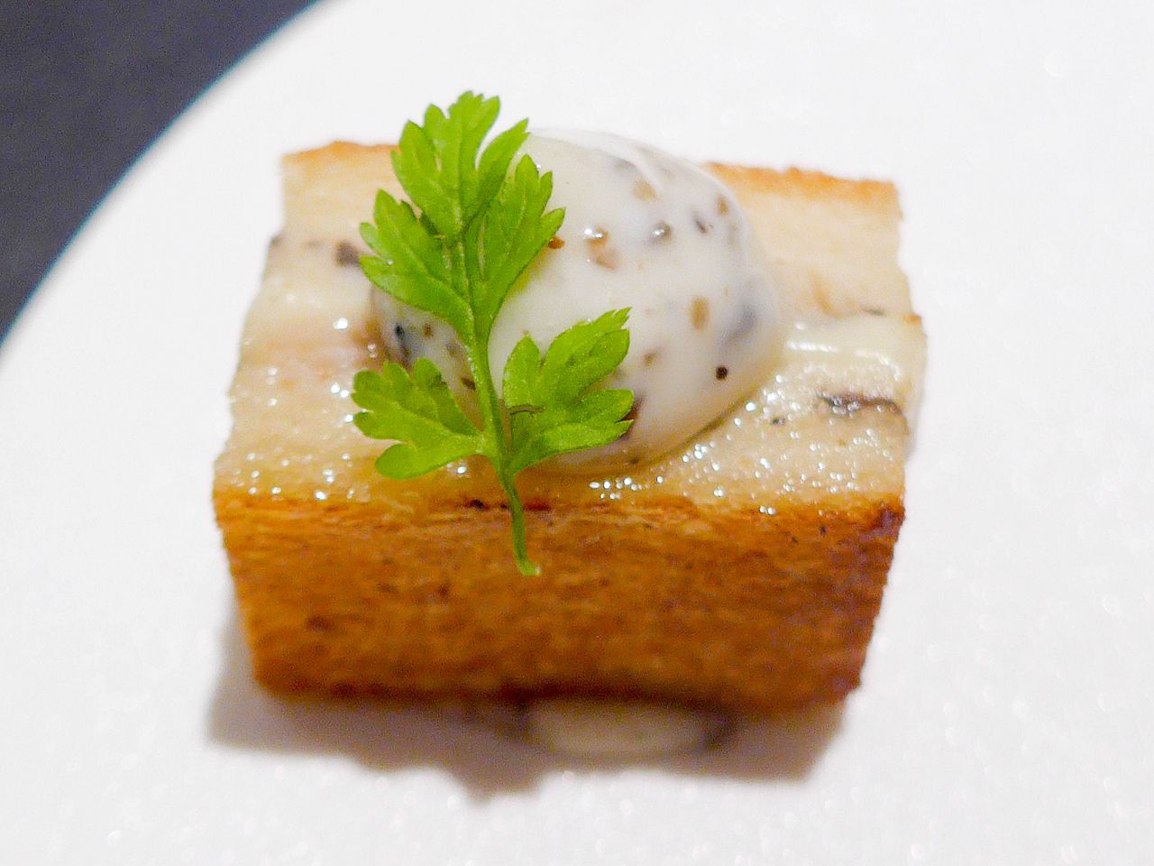 以佛卡夏麵包夾入六甲田莊起司、雞肉、松露做成迷你型三明治,