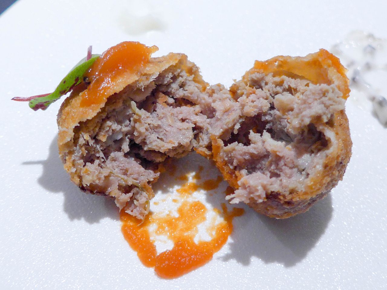 選用日本F1級牛肉加入莫札瑞拉起司製作的炸肉丸,