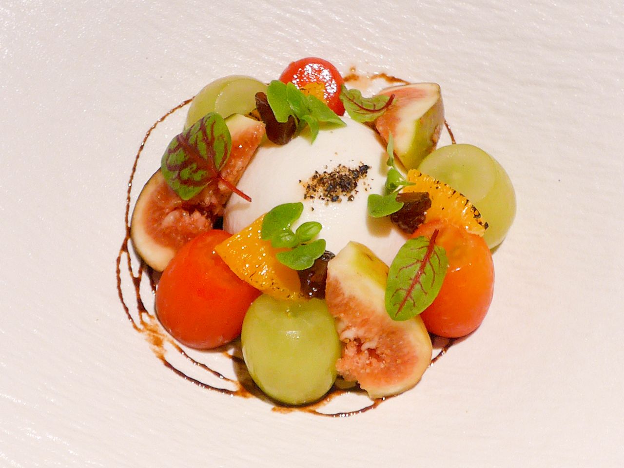 搭配馬西雅橄欖油、酸酸的蕃茄、鮮甜無花果和綠葡萄,以及巴薩米克醋,