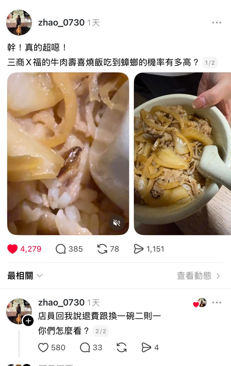 [新聞] 中市連鎖大型餐廳 牛肉壽喜燒飯裡有蟑螂