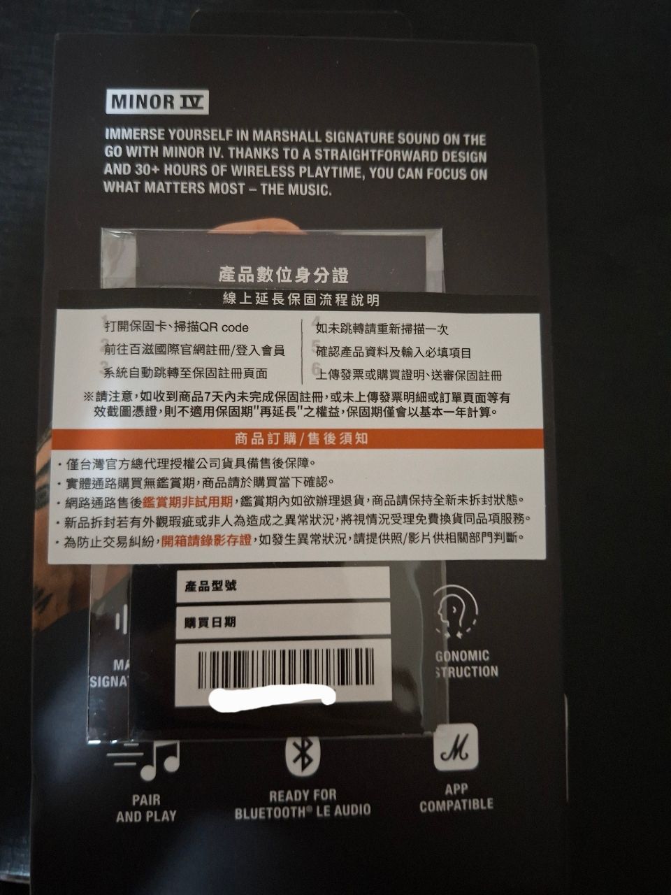 商品名稱:全新 Marshall minor IV 藍牙無線耳機