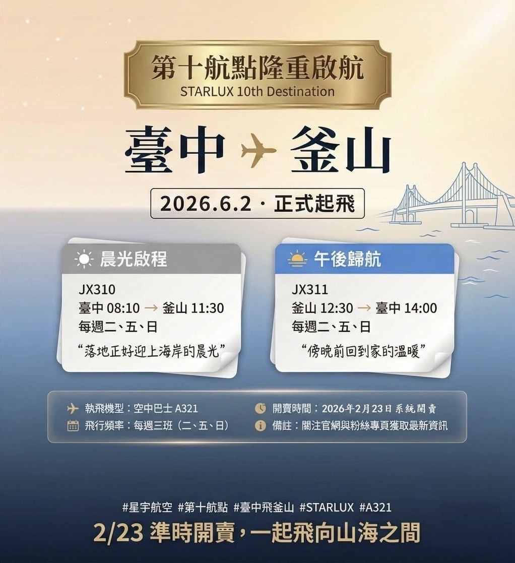 [閒聊] 星宇6/2開航 台中<=>釜山 2/23開賣1周3班