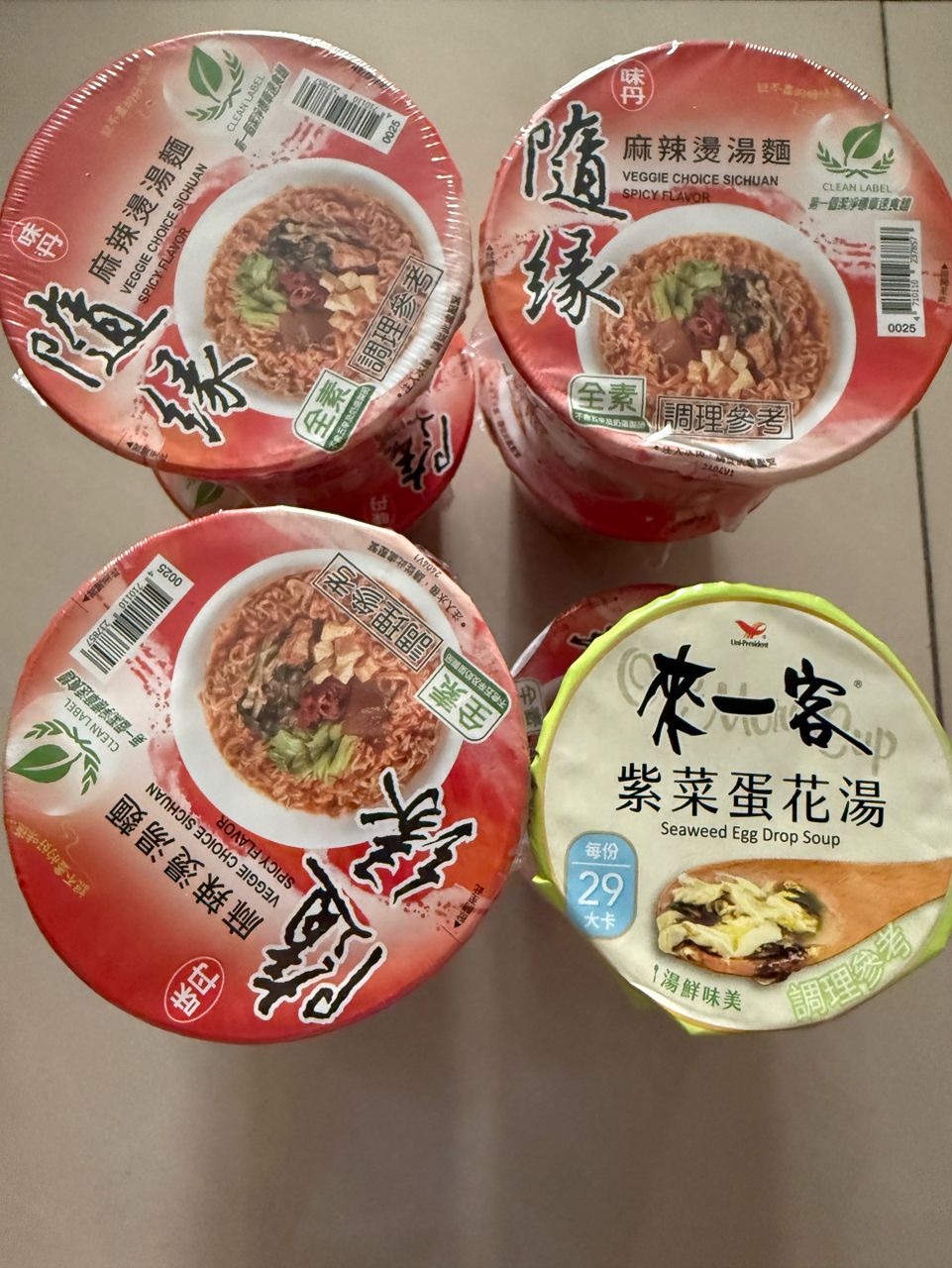 2.素食麻辣燙杯麵(4/9到期,共七杯,有些外觀有撞到)+來一客紫菜蛋花湯(已拆封,