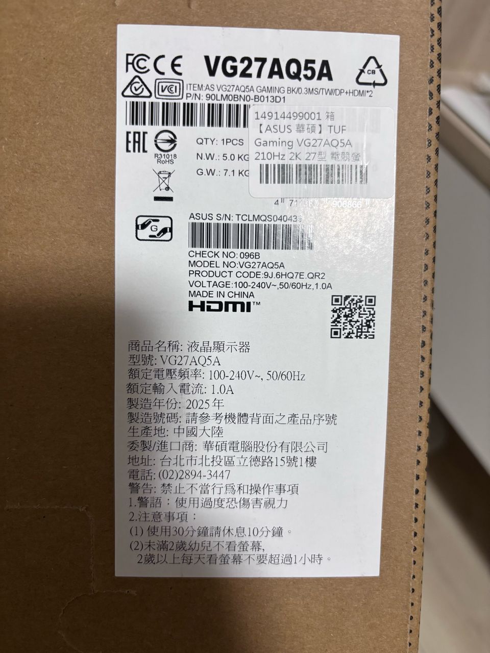 出售 華碩27吋VG27AQ5A電競螢幕