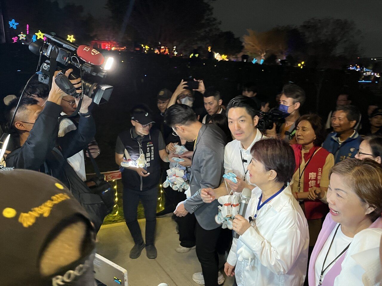 盧秀燕、蔣萬安接著合體賞燈區,兩人沿路邊賞燈邊發姆明小提燈,更有不少民眾爭相與