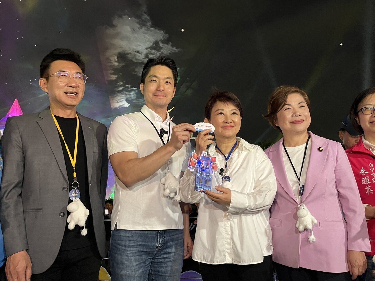 蔣萬安一到場,兩人直衝主燈區賞燈,蔣大讚「好好看,收穫滿滿」。盧秀燕先致贈台中