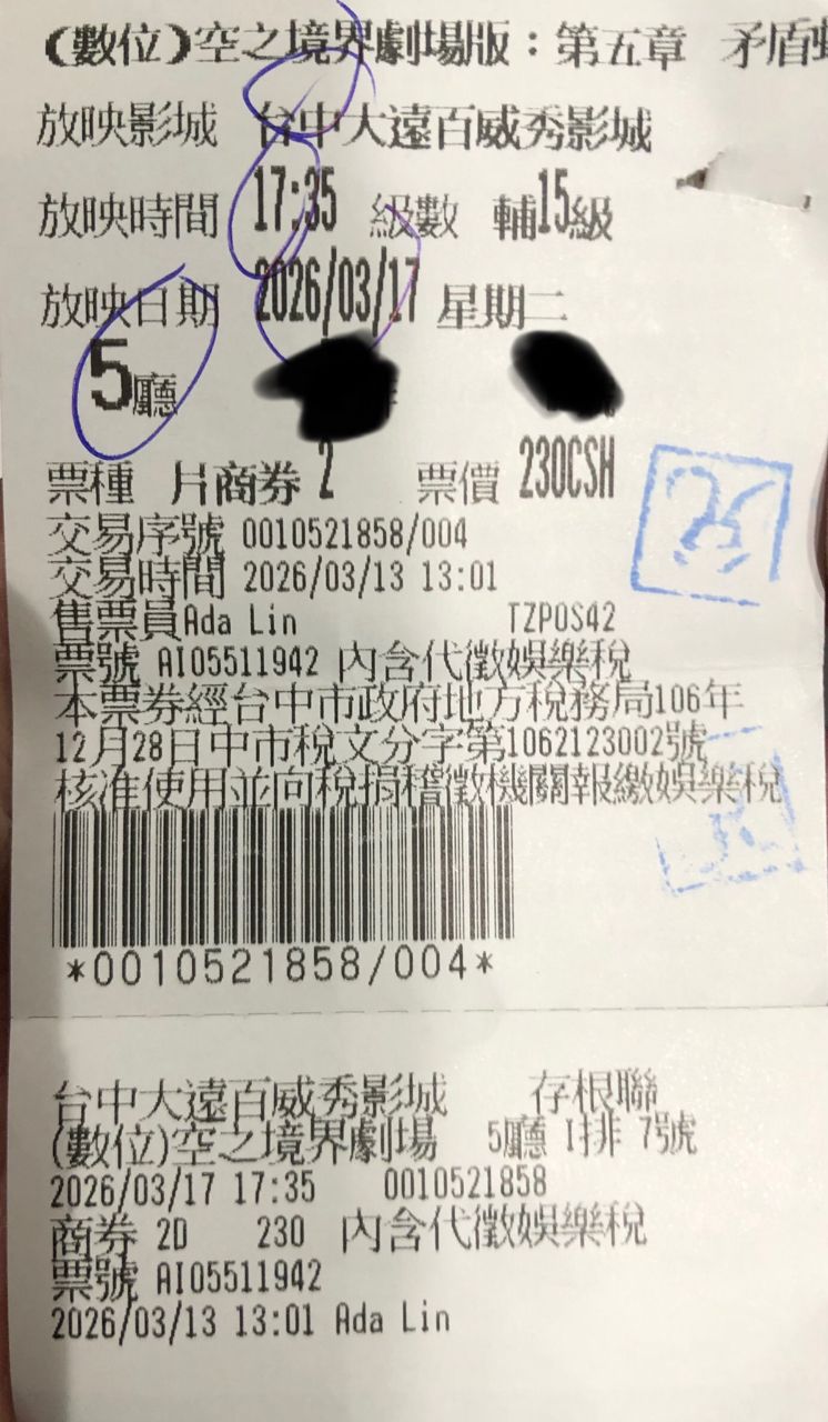 票面 2026/ 03/ 17 (二)晚上5點35分開演