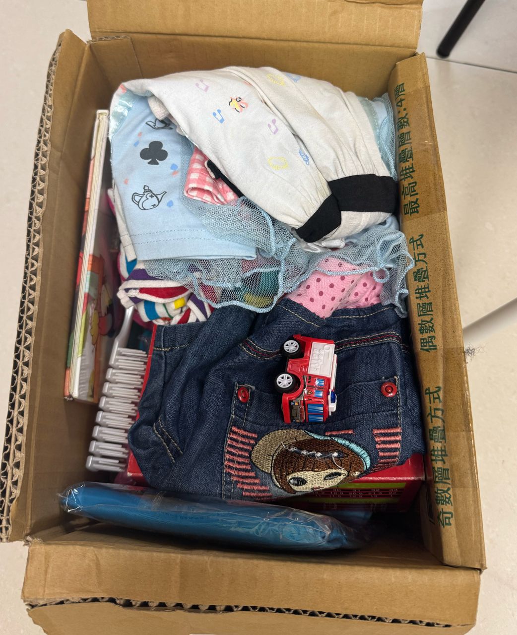 有二手童書、連身褲、新的飯店梳、裙子褲子等