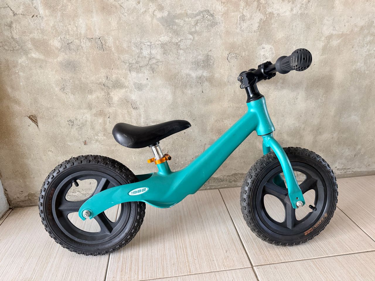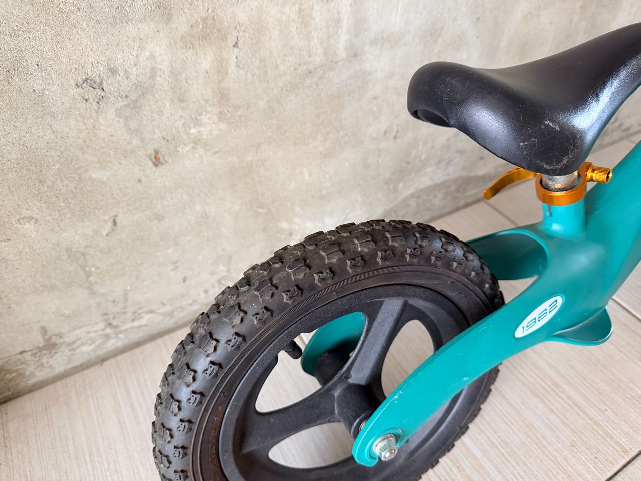 大約七八成新兒童滑步車,顏色是很漂亮又特別的孔雀綠,十二寸的規格適合幼幼班及小