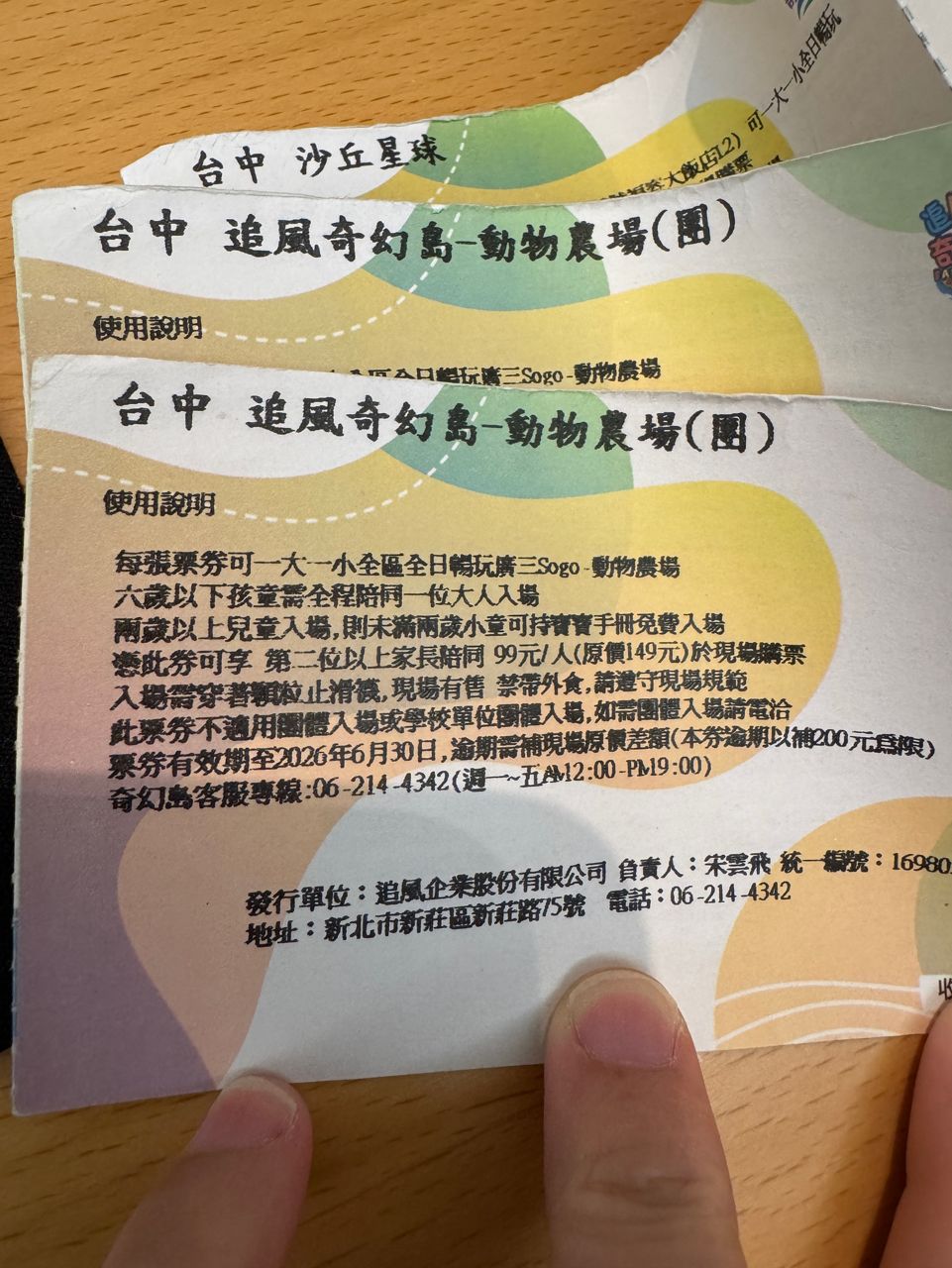 物品A/價格:【售$400】,3張一起賣,追風奇幻島2張期限到2026/6/30,沙丘星球1張期