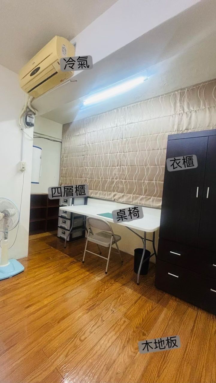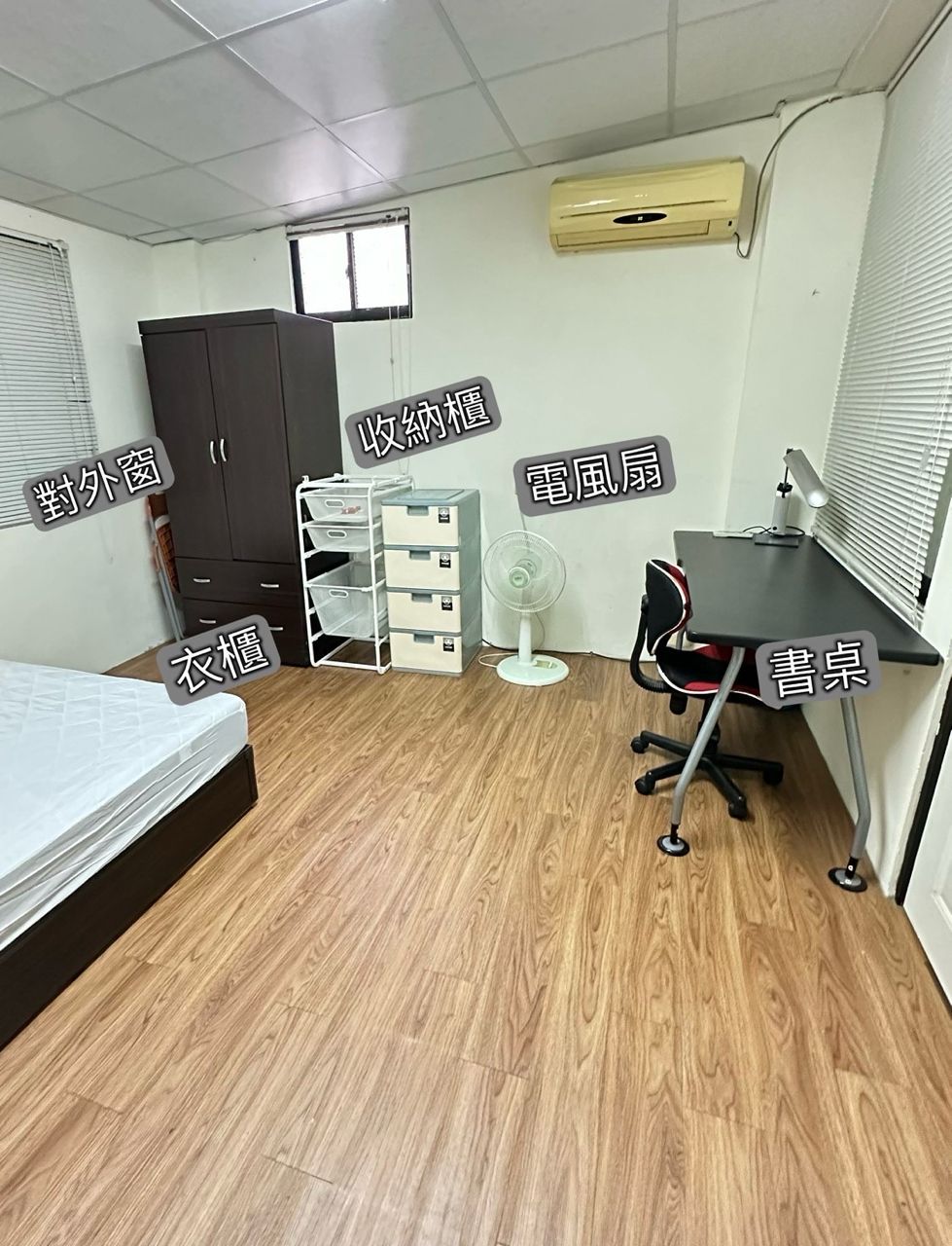 冷氣、電風扇、網路、書桌、椅子、衣櫃、書櫃、鞋櫃