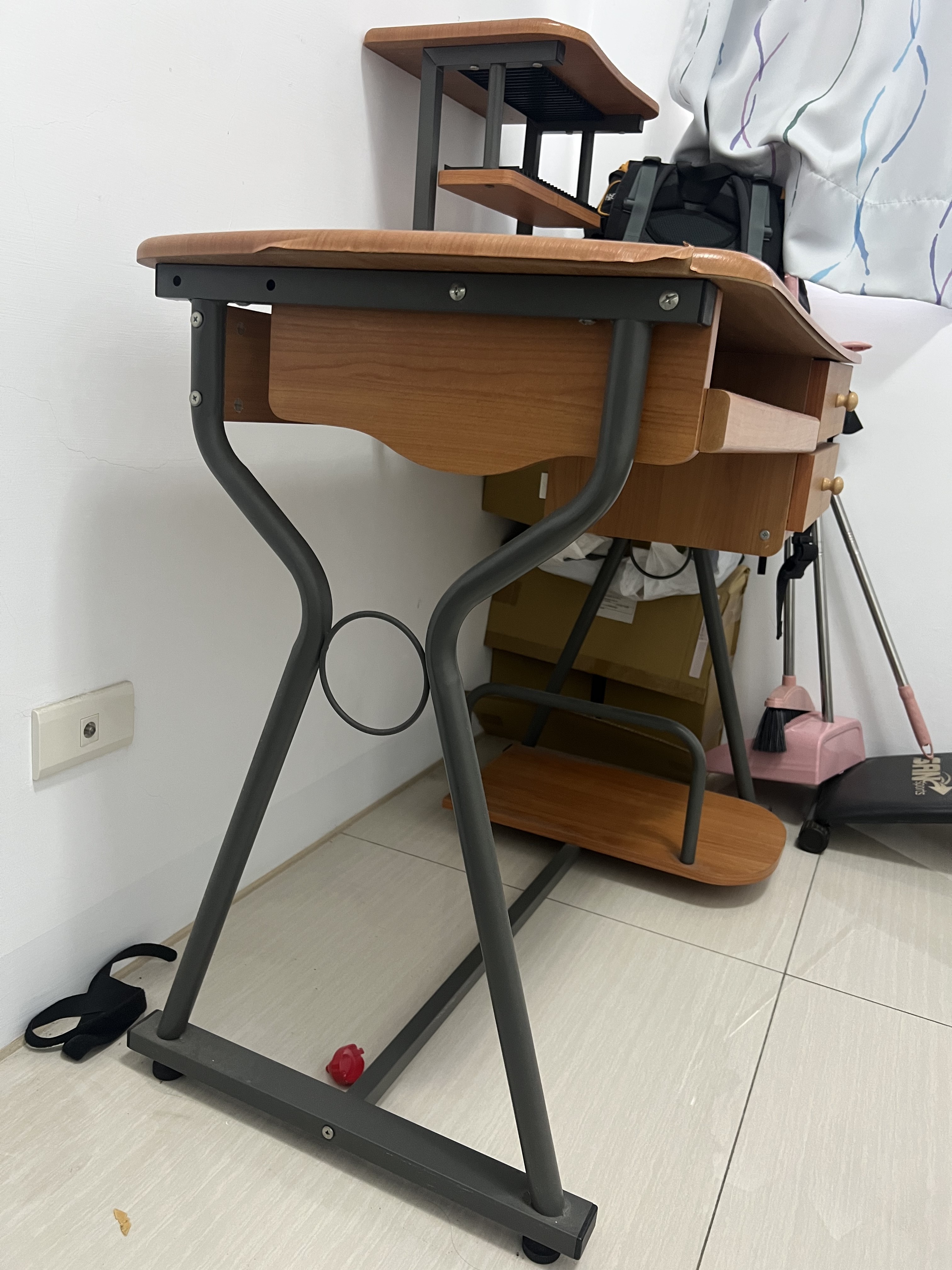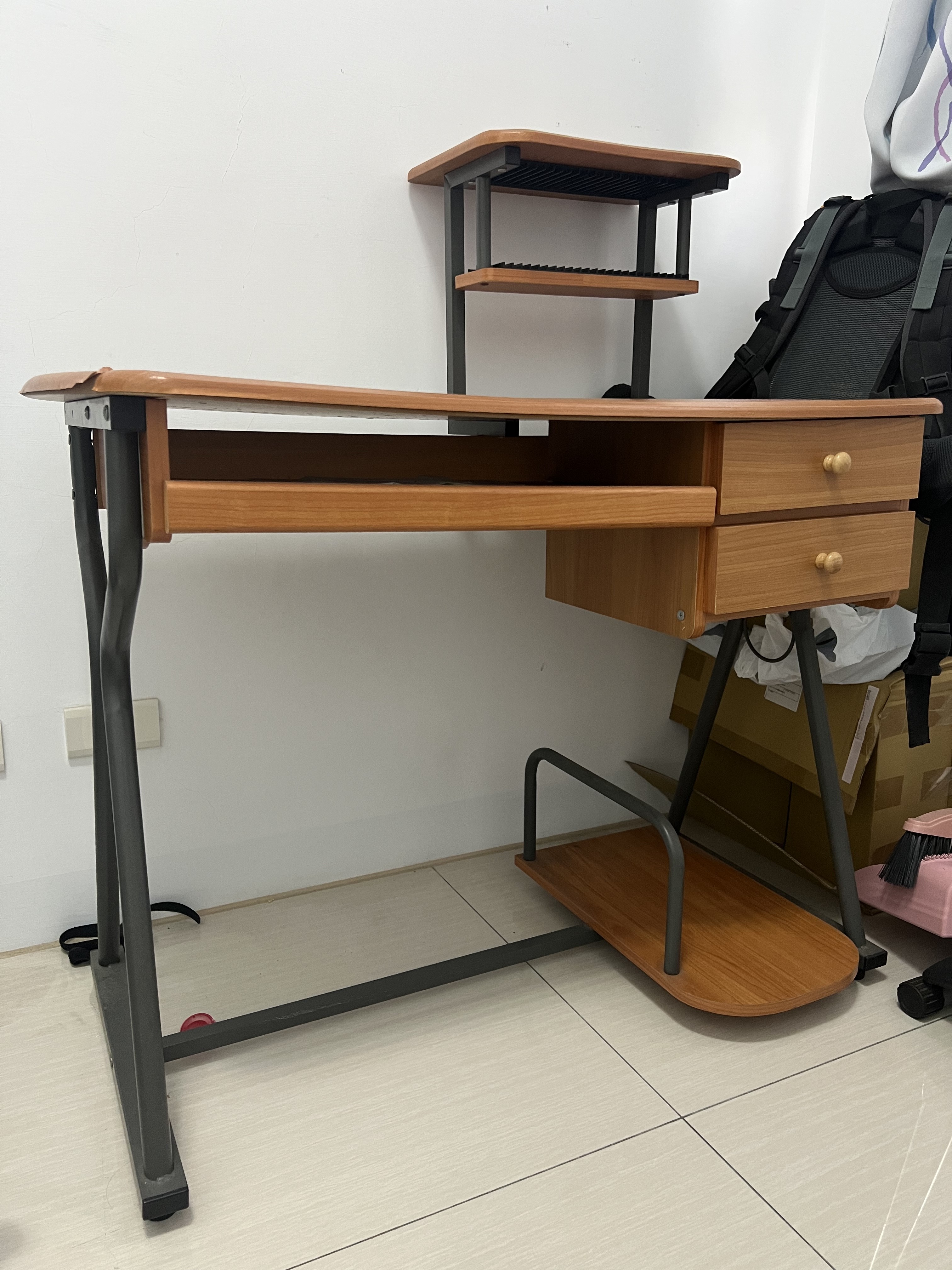1. 簡易電腦桌,表面貼皮似乎有些浮起來,桌面有點凹陷。