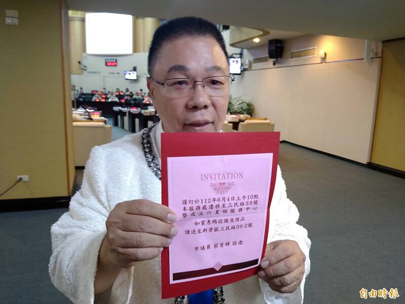 國民黨台南市議員蔡育輝出示服務處喬遷邀請函,表示邀請局處長只是禮尚往來。記者吳